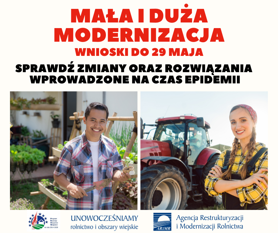 Do 29 maja Agencja Restrukturyzacji i Modernizacji Rolnictwa prowadzić będzie nabory na zadania związane z modernizacją gospodarstw rolnych oraz restrukturyzacją małych gospodarstw. Poniżej znajdują się szczegółowe informacje o rozwiązaniach przyjętych przez ARiMR, w związku z naborami prowadzonymi w stanie epidemii.