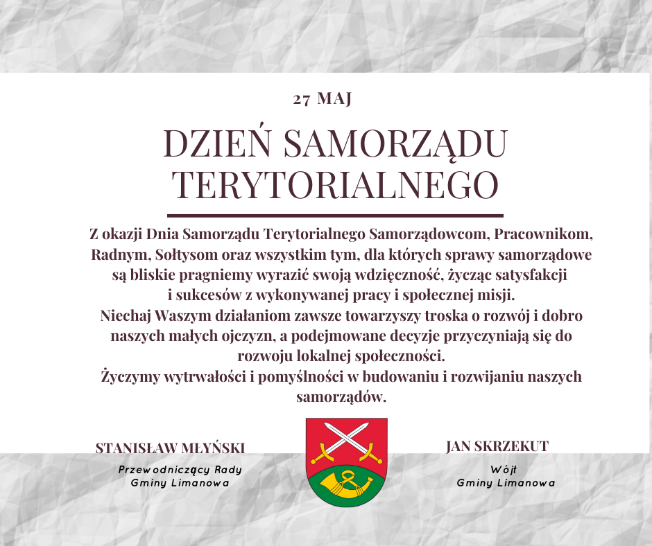 Z okazji Dnia Samorządu Terytorialnego Samorządowcom, Pracownikom, Radnym, Sołtysom oraz wszystkim tym, dla których  przez te 30 lat  sprawy samorządowe były oraz są nadal bliskie pragniemy wyrazić swoją wdzięczność, życząc satysfakcji i sukcesów z wykonywanej pracy i społecznej misji. Niechaj Waszym działaniom zawsze towarzyszy troska o rozwój i dobro naszych małych ojczyzn,