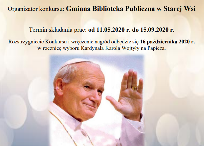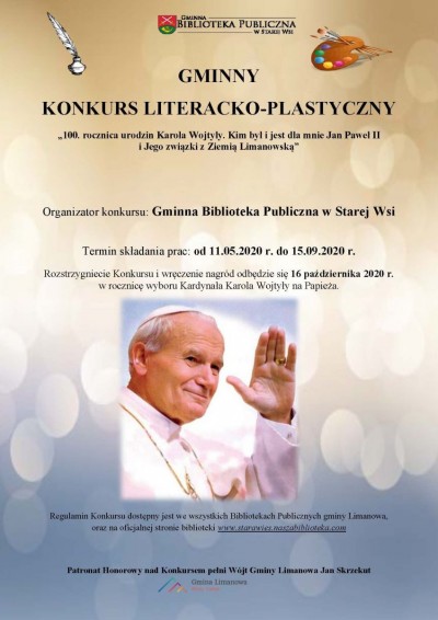 Gminna Biblioteka Publiczna w Starej Wsi ogłosiła Gminny Konkurs Literacko-Plastyczny pt : „100. rocznica urodzin Karola Wojtyły. Kim był i jest dla mnie Jan Paweł II i Jego związki z Ziemią Limanowską”. Konkurs będzie polegał na wykonaniu przez Czytelników – mieszkańców gminy Limanowa – prac plastycznych oraz utworów literackich. Trwał będzie od 11.05.2020 r. do 15.09.2020 r. i przeprowadzony zostanie w dwóch kategoriach: