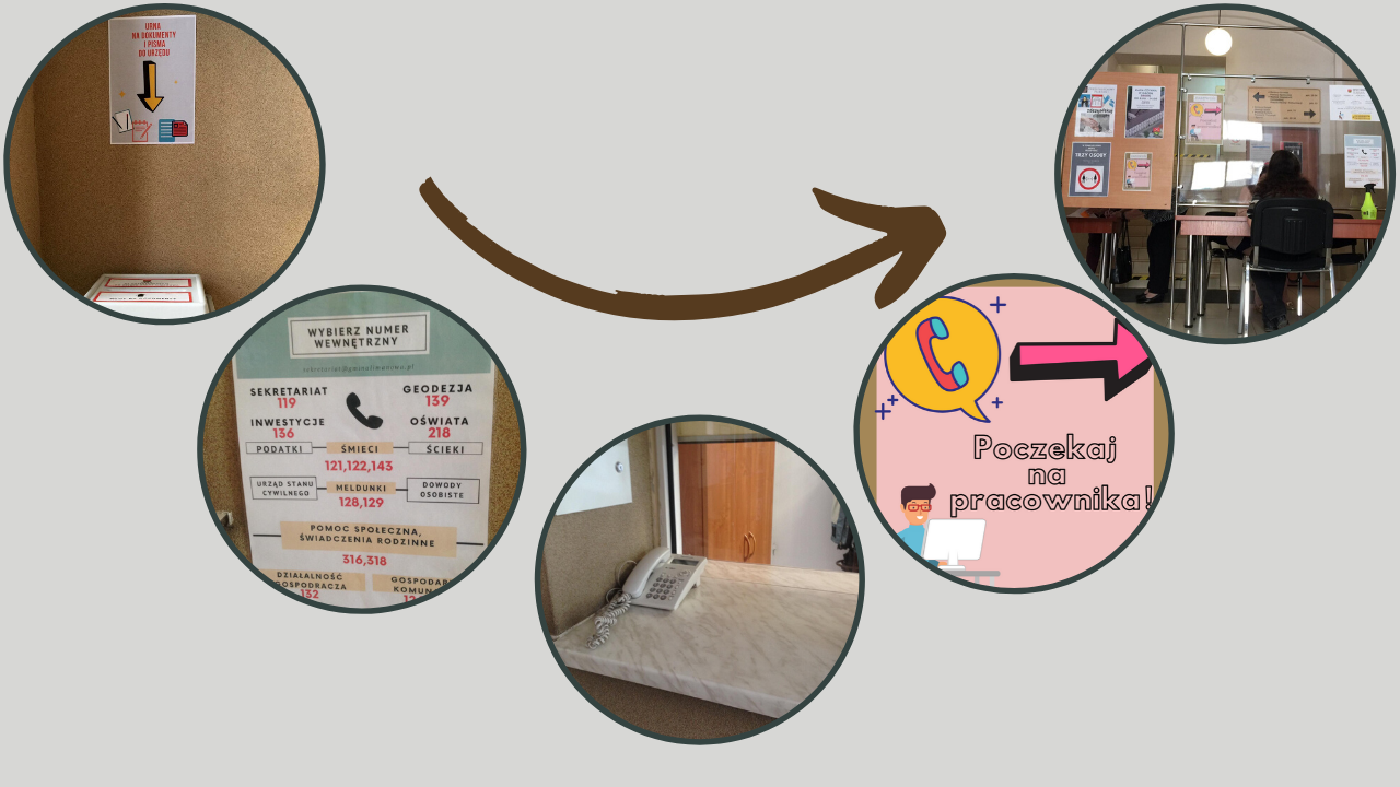 Prosimy o nie przemieszczanie się po innych obszarach Urzędu Gminy. Jeżeli mieliby Państwo inną sprawę do załatwienia to oczywiście jest możliwe, ale na zasadach ogólnie przyjętych w Urzędzie Gminy.