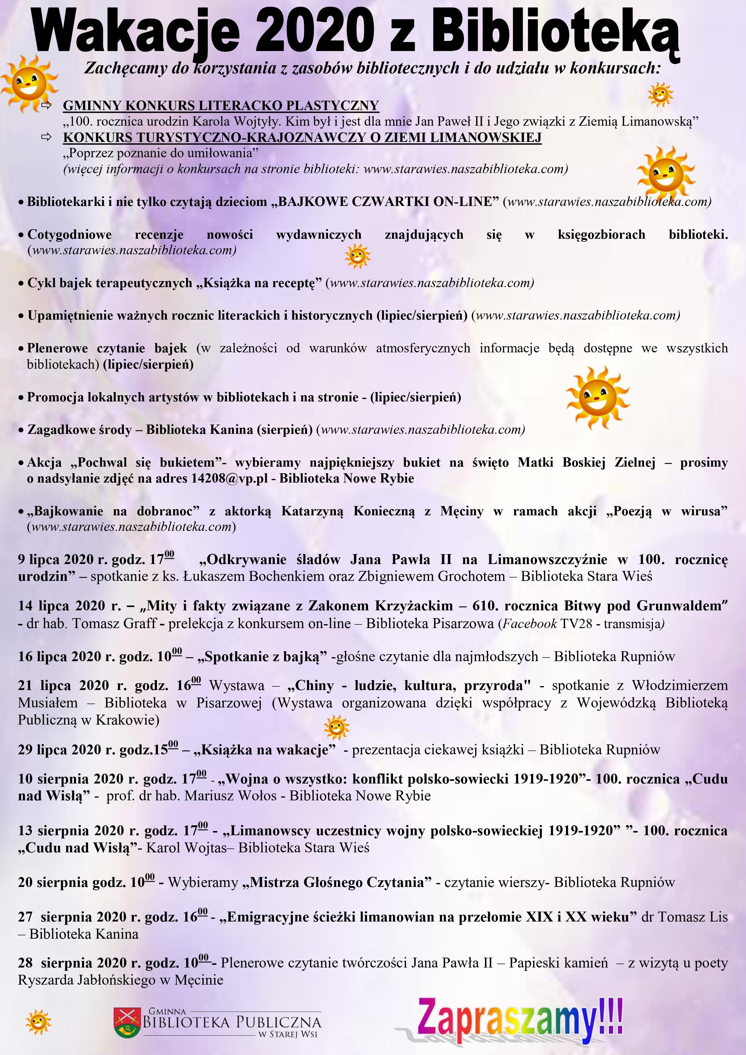 Jak co roku,  Gminna Biblioteka Publiczna w Starej Wsi oraz wszystkie filie serdecznie zapraszają dzieci, młodzież oraz seniorów na zajęcia wakacyjne. Oferta podczas tegorocznych wakacji jest bardzo różnorodna. Każdy z czytelników znajdzie coś dla siebie. Prócz bogatej oferty księgozbiorów biblioteka organizuje również wykłady o różnorodnej tematyce. Spotkania z prelegentami pozwolą nie tylko miło i ciekawie spędzić czas, ale również pobudzić wyobraźnię, zdobyć wiedzę oraz bliżej poznać lokalną historię . Udział w zajęciach jest bezpłatny.