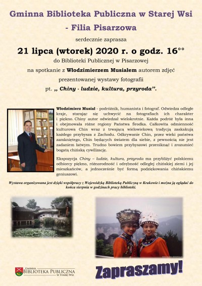 Ekspozycja „Chiny – ludzie, kultura, przyroda” ma przybliżyć polskiemu odbiorcy piękno, różnorodność i odrębność odległej chińskiej ziemi i jej mieszkańców, a jednocześnie być formą podziękowania chińskiemu geniuszowi. Gminna Biblioteka Publiczna w Starej Wsi miała przyjemność gościć Włodzimierza Musiała na otwarciu jego wystaw fotograficznych, m. in. o Afryce. Spotkania te były fascynującą podróżą w czasie i przestrzeni, okraszoną anegdotami, ciekawostkami i dużą wiedzą, sprawnie przekazywaną przez prelegenta.
