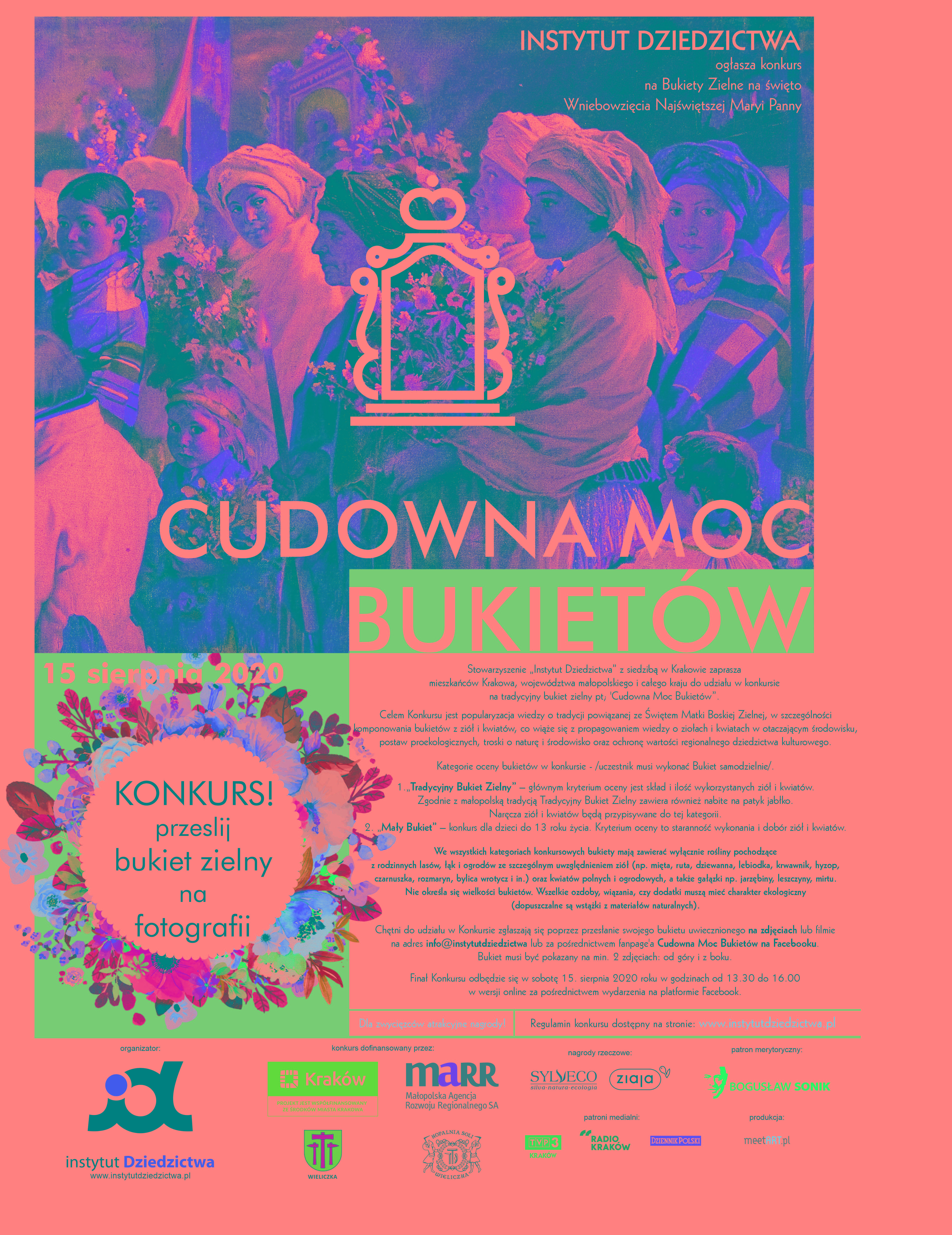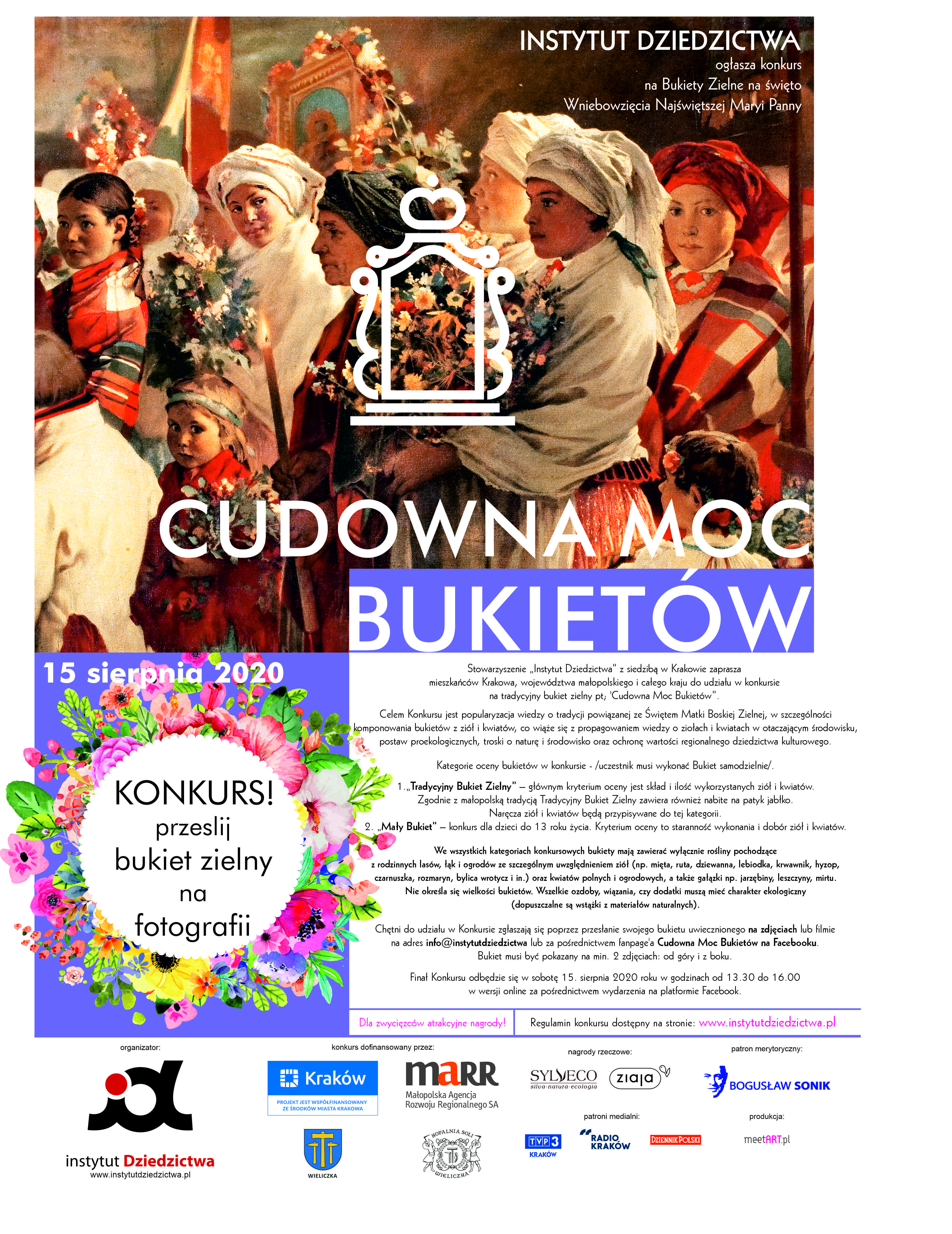 Instytut Dziedzictwa ogłasza XII edycję konkursu „Cudowna moc bukietów”. Z uwagi na sytuację epidemiologiczną, konkurs odbędzie się w formie internetowej. W konkursie mogą wziąć udział wszyscy, bez żadnych ograniczeń wiekowych. Konkurs dotowany jest wieloma cennymi nagrodami, a rozstrzygnięcie będzie miało miejsce 15. sierpnia 2020 r. o godzinie 15.30 w czasie transmisji na żywo na platformie YouTube oraz Facebook, więcej informacji na stronie www.cudownamocbukietow.pl.