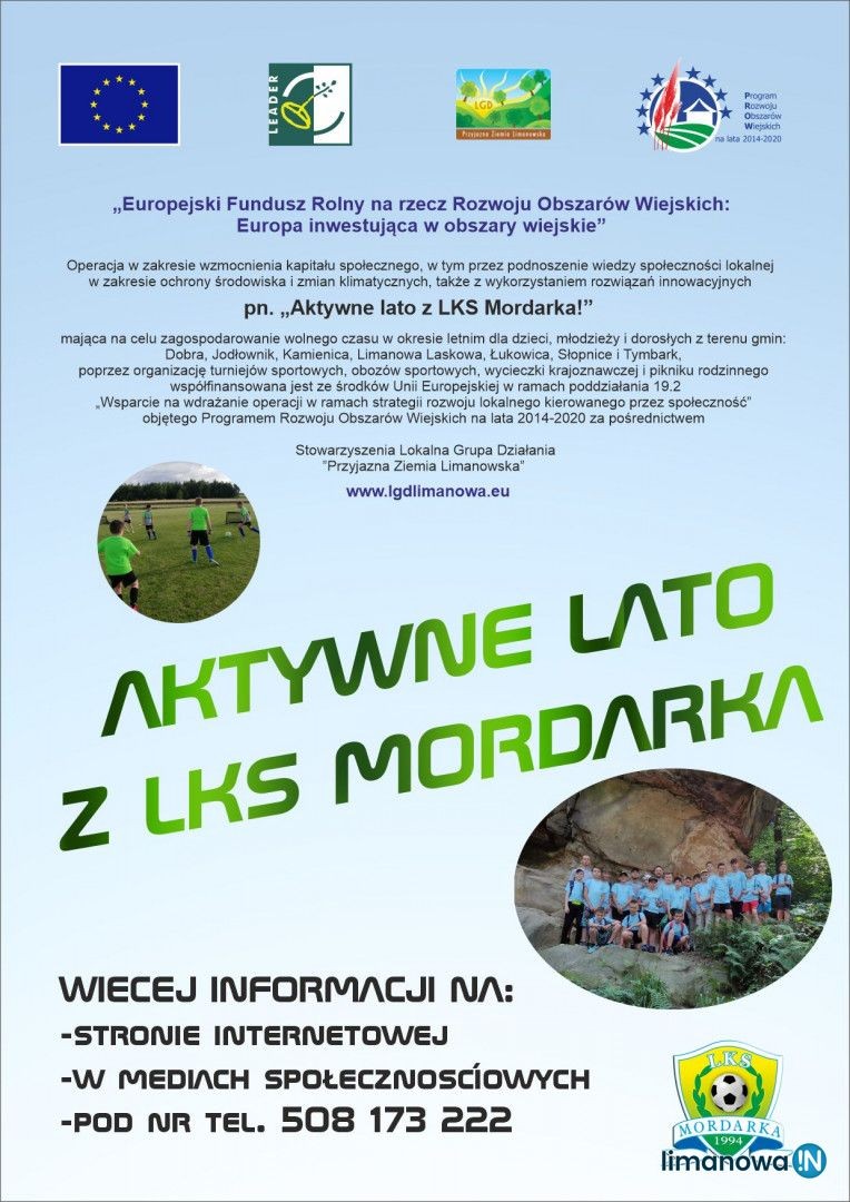 • Obozy sportowe zorganizowane pod hasłem: „Aktywne lato z LKS Mordarka!" przeznaczone są dla dzieci i młodzieży z terenu gmin: Dobra, Jodłownik, Kamienica, Limanowa, Laskowa, Łukowica, Słopnice i Tymbark dla trzech kategorii wiekowych: