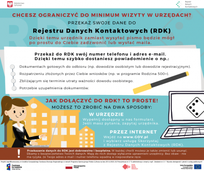 "Chcesz mieć pewność, że urząd ma Twoje aktualne dane kontaktowe – numer telefon i adres e-mail? Przekaż je do Rejestru Danych Kontaktowych (RDK). Dzięki temu urzędnik w ważnych dla Ciebie sprawach zamiast wysyłać pismo – będzie mógł po prostu zadzwonić." - Ministerstwo Cyfryzacji zachęca do dołączenia do bazy danych.