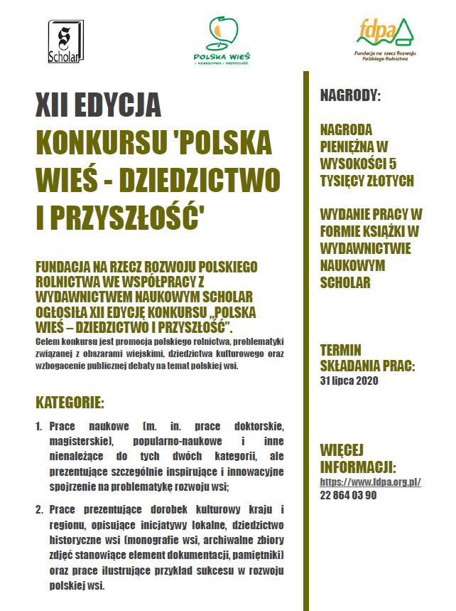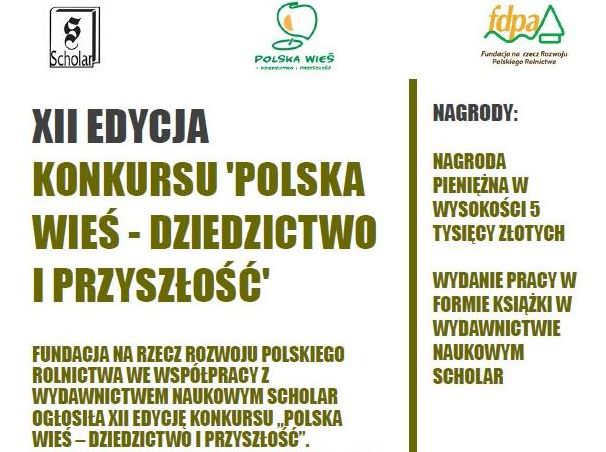 Fundacja na rzecz Rozwoju Polskiego Rolnictwa ogłosiła XII edycję konkursu „Polska wieś – dziedzictwo i przyszłość. Celem konkursu jest promocja polskiego rolnictwa, problematyki związanej z obszarami wiejskimi, dziedzictwa kulturowego oraz wzbogacenie publicznej debaty na temat polskiej wsi.