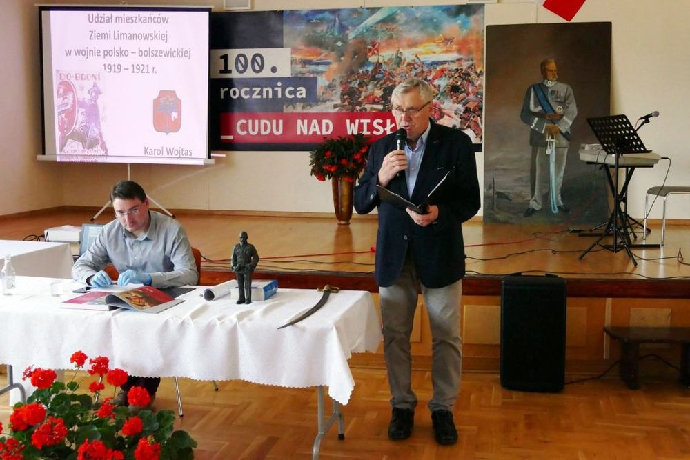 Karol Wojtas na początku wykładu, przedstawił w skrócie przebieg wojny polsko – bolszewickiej: od momentu przyjętego przez historyków za jej początek, w lutym 1919 roku poprzez kolejne jej etapy takie jak np. Wyprawa Kijowska na wiosnę 1920 roku, a następnie Bitwę Warszawską w sierpniu 1920 roku oraz bitwy pod Komarowem i nad Niemnem do zawieszenia broni, a później traktatu pokojowego w Rydze zawartego w marcu 1921 roku. Następnie przedstawił sylwetki mieszkańców Ziemi Limanowskiej, którzy walczyli w wojnie polsko – bolszewickiej w latach 1919 – 1920. Jak podkreślił osób z naszego regionu, które wzięły udział w walkach było dość sporo, ale dziś po stu latach lokalnym historykom znane są nazwiska tylko pewnej części. Dodał, że trzeba spróbować zrobić listę takich osób i prosił, aby rodziny żołnierzy, którzy stanęli do walki sto lat temu podzielili się informacjami z lokalnymi historykami. Karol Wojtas wymienił takie postacie jak pochodzących z Limanowej żołnierzy, miedzy innymi: Józefa Jońca 1900 – 1956 (późniejszy kapelan SBSK i 3 DSK pod Tobrukiem i Monte Cassino podczas II Wojny Światowej), który jako młody chłopak walczył z sowietami, jako żołnierz 8 Pułku Ułanów z Krakowa, Franciszka Jabruckiego 1892 – 1966, Jana Biedronia 1902 – 1998, walczącego w 77 Pułku Piechoty, Adama Mamaka 1896 – 1962 (późniejszego działacza ludowego, weterynarza i starostę limanowskiego), bohatera 2 Pułku Strzelców Podhalańskich, Zygmunta Berlinga 1896 – 1980, który walczył w 4 Pułku Piechoty Legionów, Mieczysława Mordarskiego seniora 1888 – 1959, uczestnika walk 1 Pułku Strzelców Podhalańskich. Oprócz tego wymienił także urodzonych w Limanowej żołnierzy Kazimierza Weryńskiego, Tadeusza Rozwadowskiego oraz Józefa Sikorę. Dodał także, że w wojnie polsko – bolszewickiej walczył urodzony w Budzowie, ale przez większość życia związany z Ziemią Limanowską Józef Marek 1900 – 1958 który walczył, jako żołnierz ochotnik w 2 Pułku Artylerii. Z Pisarzowej pochodził walczący w tej wojnie Stefan Stolarz, który to w 1940 roku zginął w Katyniu. Prelegent wymienił jeszcze kilkanaście sylwetek żołnierzy pochodzących z Jodłownika, Kamienicy, Przyszowej, Tymbarku i Mszany Dolnej. Dopełnieniem wykładu Karola Wojtasa były wypowiedzi kilku uczestników spotkania, którzy opowiedzieli o swoich członkach rodzin, którzy sto lat temu stanęli w obronie Polski przed armią czerwoną. Niektórzy z uczestników przynieśli także pamiątki po swoich dziadkach, którzy wzięli udział w wojnie polsko – bolszewickiej. Jednym z przemawiających był Leszek Mordarski, radny miejski, który przyniósł pamiątki po swoim dziadku, Mieczysławie Mordarskim Seniorze. Mieczysław brał udział w wyprawie na Kijów. Po zdobyciu przez Polaków Kijowa dyrygował Orkiestrą I PSP podczas defilady ulicami stolicy Ukrainy. Uczestnicy z wielkim zainteresowaniem oglądali szablę paradną i pamiątkowy medal.