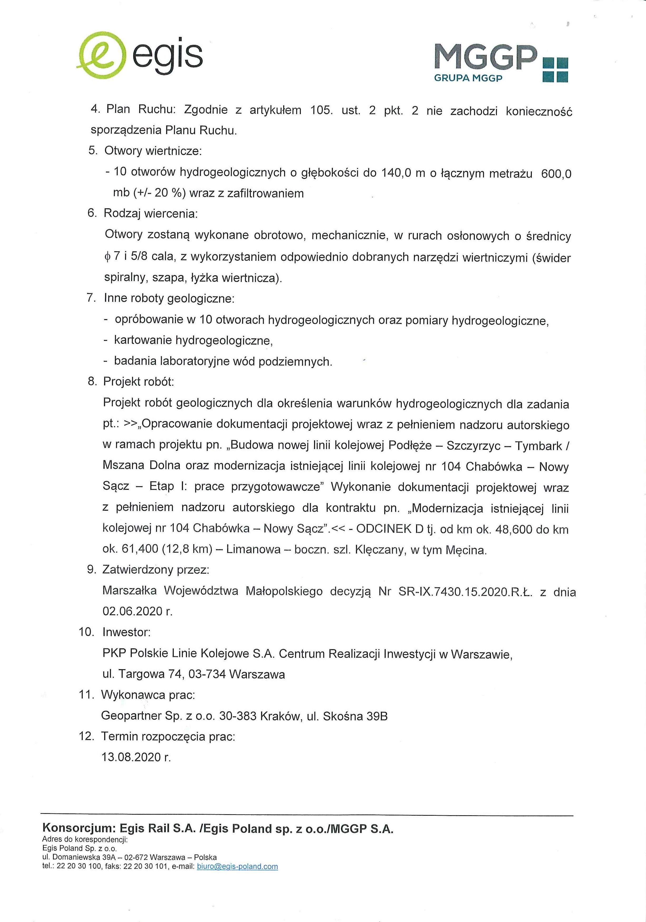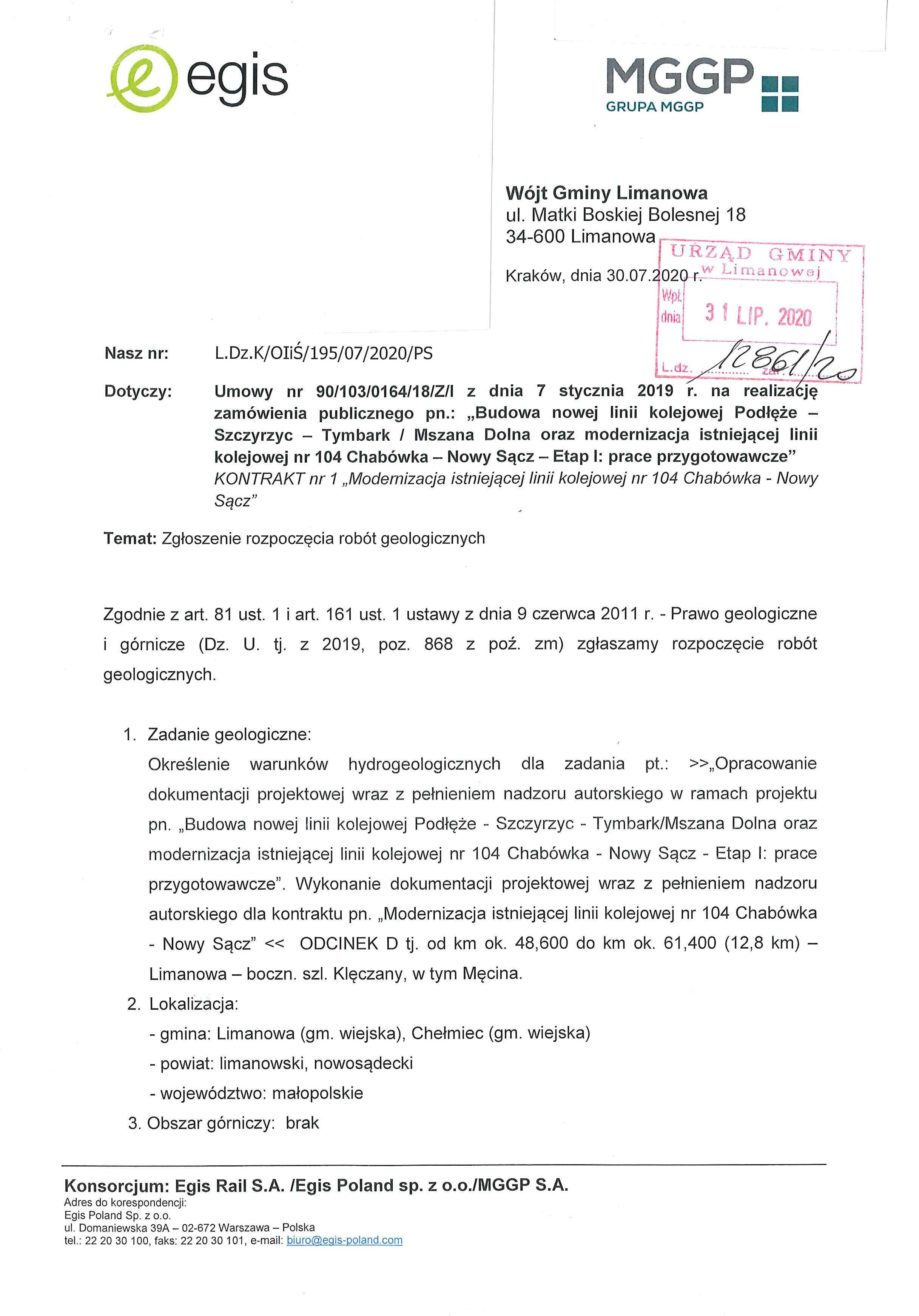 Informujemy, że dnia 31 lipca do Urzędu Gminy Limanowa wpłynęła informacja od Wykonawcy dotycząca zgłoszenia rozpoczęcia robót geologicznych, w związku z zadaniem pn. "Budowa linii kolejowej Podłęże - Szczyrzyc - Tymbark/Mszana Dolna oraz modernizacja istniejącej linii kolejowej nr 104 Chabówka - Nową Sącz  - Etap I:prace przygotowawcze" KONTRAKT nr 1 "Modernizacja istniejącej linii kolejowej nr 104 Chabówka-Nowy Sącz".