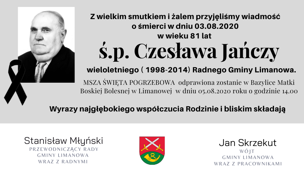Wyrazy najgłębokiego współczucia Rodzinie i bliskim składa Rada Gminy Limanowa na czele z przewodniczącym Stanisławem Młyńskim oraz Wójt Gmin y Limanowa Jan Skrzekut z pracownikami Urzędu Gminy.