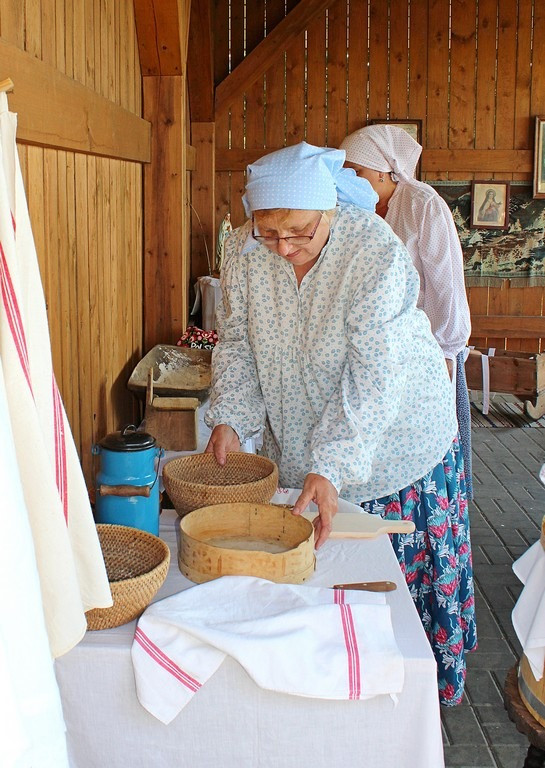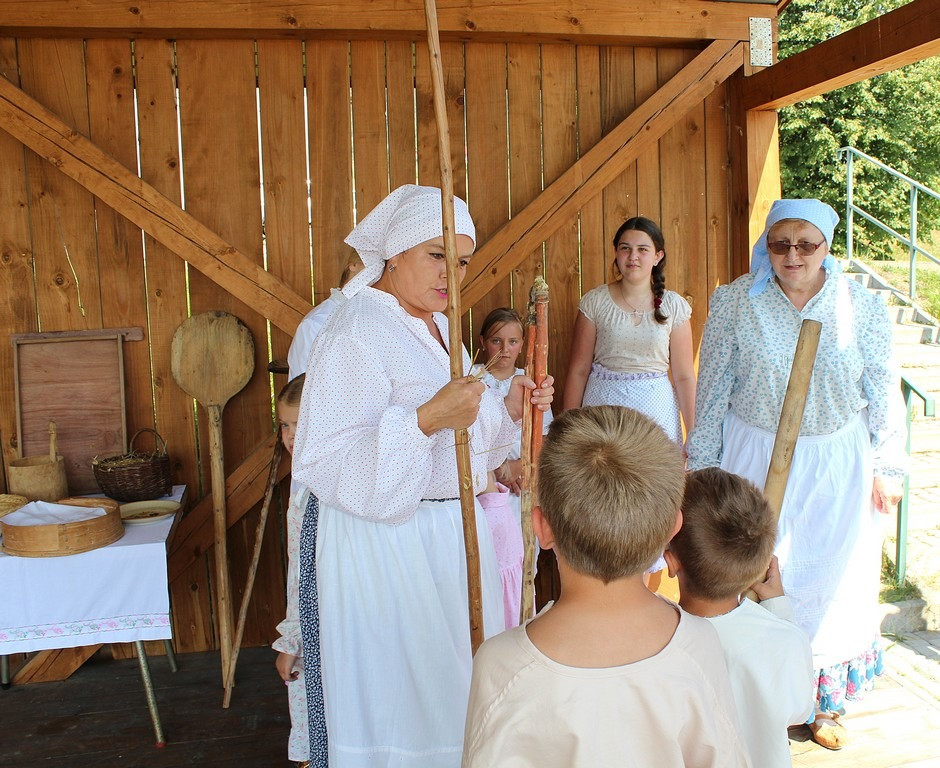- Zanim przyszło do samego pieczenia, ktoś musiał wybudować dobry piec, zrobić i to ręcznie mnóstwo narzędzi i naczyń, najczęściej drewnianych: wystrugać dzieże, zrobić przetaki, upleść koszyki do rośnięcia bochenków, zrobić łopatę do pieca, przygotować suche polana do palenia. Samo wyrabianie ciasta również wymagało ciężkiej, ręcznej pracy. Pieczenie chleba to był rytuał, czynność celebrowana niemal jak święto, a umiejętności mistrzowskiego wypieku dziewczęta uczyły się od swoich babek i matek od dziecka. Czas rośnięcia, pieczenia, temperatura wewnątrz pieca chlebowego - ta wiedza wymagała lat obserwacji i praktyki. Gospodynie miały również swoje sposoby na zachowanie świeżości chleba przez długi czas (dodawały mielonych, gotowanych ziemniaków czy serwatki do ciasta), i wzbogacenia jego smaku (posypywały bochenki ziarnami czarnuszki czy kminku) - mówiła do uczestników projektu Małgorzata Górka.
