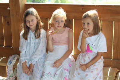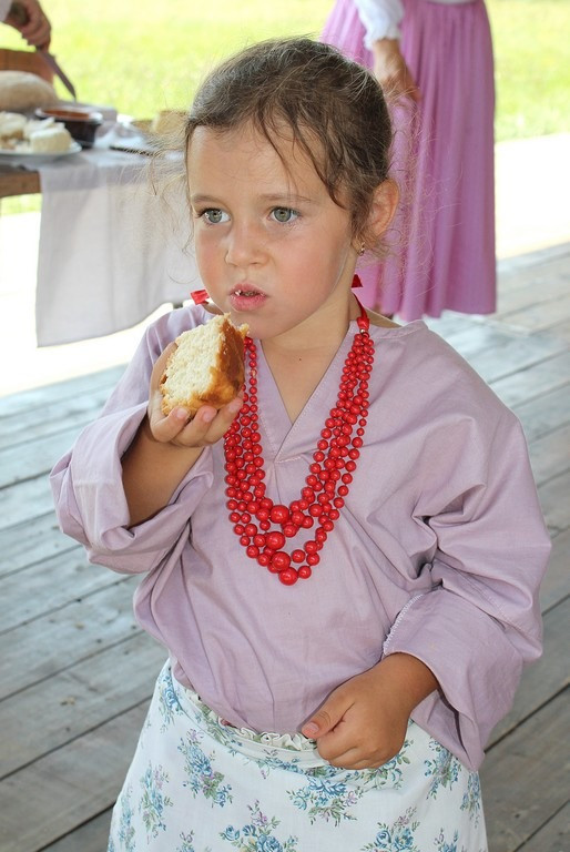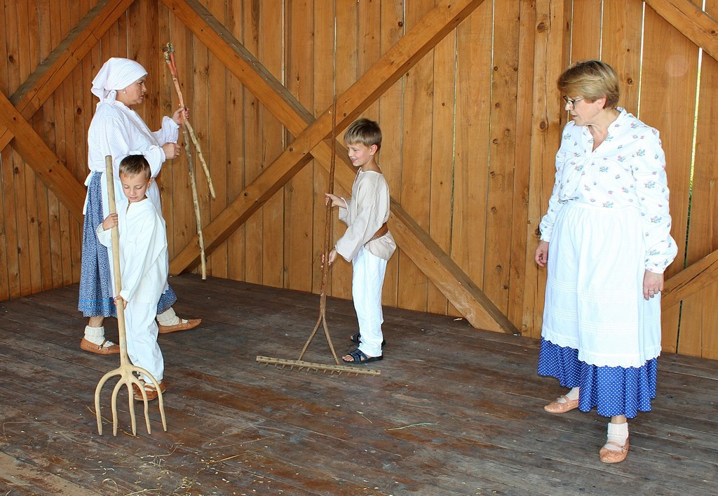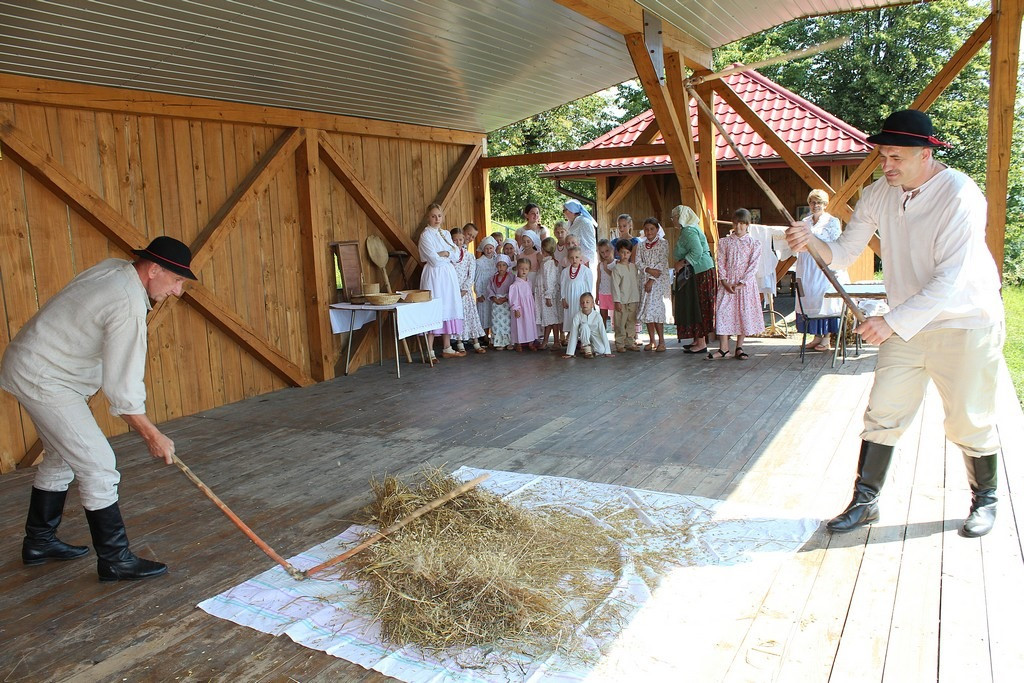 Podczas drugiej części projektu młócono zboże cepami, zarabiano w dzieży ciasto na chleb i podpłomyki, robiono ser i pieczono drożdżowe buchty. Kiedy chleb się upiekł uczestnicy zajęć wspólnie smakowali wypieki.