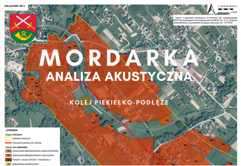 W związku z pismem K/OIiŚ/125/07/2020/PN, dotyczącym opracowania Raportu o oddziaływaniu na środowisko w ramach oceny oddziaływania na środowisko dla inwestycji pn. „Budowie nowej linii kolejowej Podłęże – Szczyrzyc – Tymbark / Mszana Dolną oraz modernizacji istniejącej linii kolejowej nr 104 Chabówka – Nowy Sącz – Etap I: prace przygotowawcze.”, obligującym tut. Urząd do sporządzenia analizy akustycznej w pasie 300 metrów od osi torów projektowanej linii kolejowej, a w dalszej kolejności do zaopiniowania lub przedstawieniu własnej propozycji klasyfikacji akustycznej dla terenu naszej gminy, w załączeniu przedstawiamy proponowaną klasyfikację akustyczną terenu dla miejscowości Mordarka sporządzoną w oparciu o posiadane informacje z zakresu istniejącej i projektowanej zabudowy na danym terenie wraz z ewentualną możliwości jej dalszej kontynuacji. Zgodnie z art. 115 Prawo Ochrony Środowiska, w przypadku braku miejscowego planu zagospodarowania przestrzennego ocenę czy teren należy do terenów, o których jest mowa w art. 113 ust. 2 pkt 1, (tzn. terenów przeznaczonych: pod zabudowę mieszkaniową, pod szpitale i domy pomocy społecznej, pod budynki związane ze stałym lub czasowym pobytem dzieci i młodzieży, na cele uzdrowiskowe, na cele rekreacyjno-wypoczynkowe, pod zabudowę mieszkaniowo-usługowa), organ dokonuje na podstawie faktycznego zagospodarowania i wykorzystania tego i sąsiednich terenów. Przy czym przepis art. 114 ust. 2 mówiący, że w przypadku terenów, które mogą być zaliczone do kilku rodzajów terenu wymienionych powyżej, uznaje się że powinien być zaklasyfikowany jak dla przeważającego rodzaju terenu.