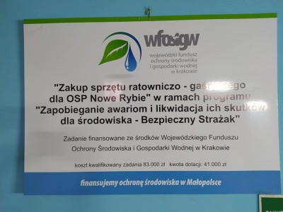 - dotacja z Wojewódzkiego Funduszu Ochrony Środowiska i Gospodarki Wodnej w Krakowie z programu "Bezpieczny Strażak" w wysokości 41 000,00 zł,