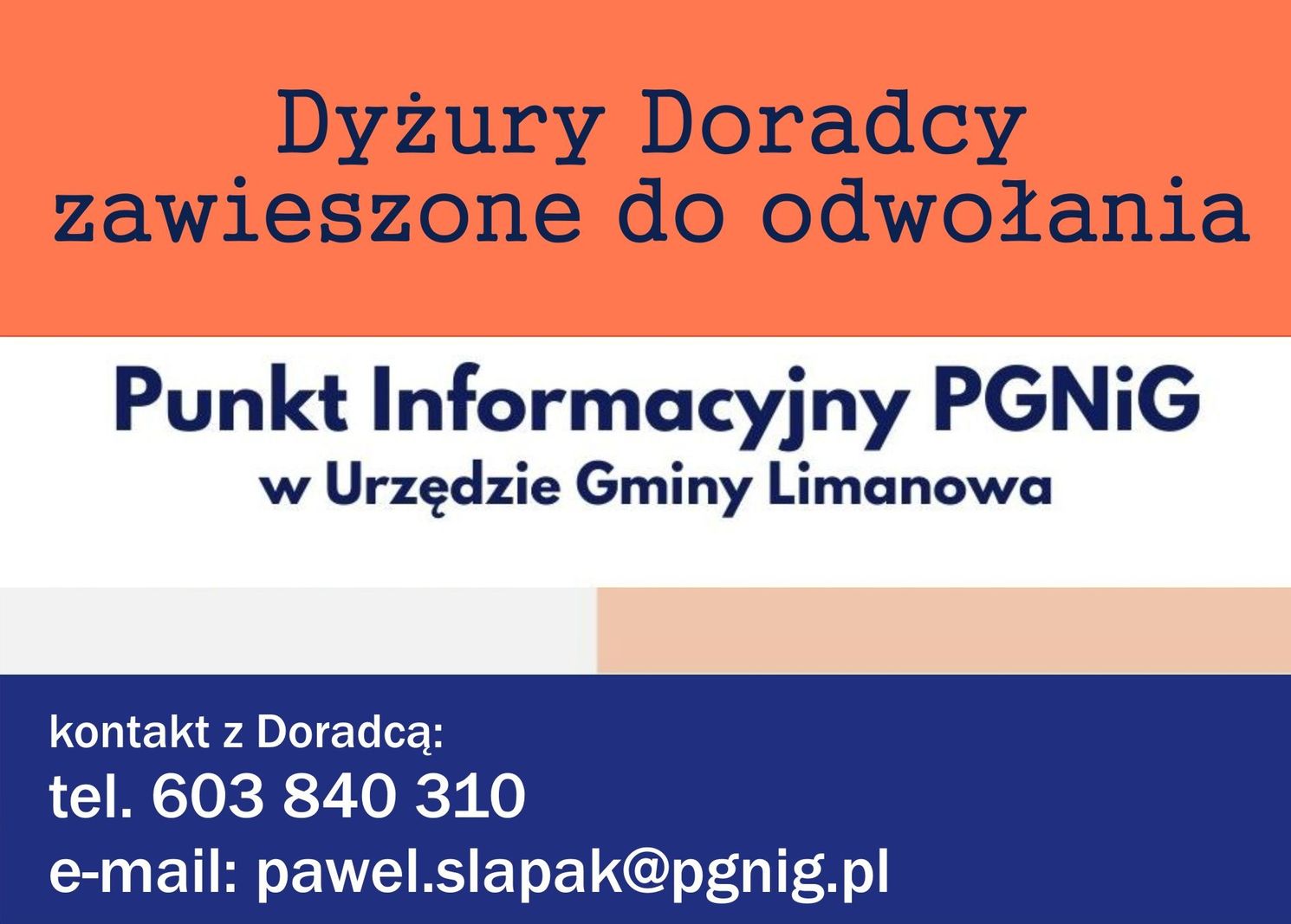 Uprzejmie informujemy, że w związku ze zwiększonym zagrożeniem epidemiologicznym ZAWIESZONE - DO ODWOŁANIA zostają dyżury Doradcy PGNiG w Urzędzie Gminy Limanowa.