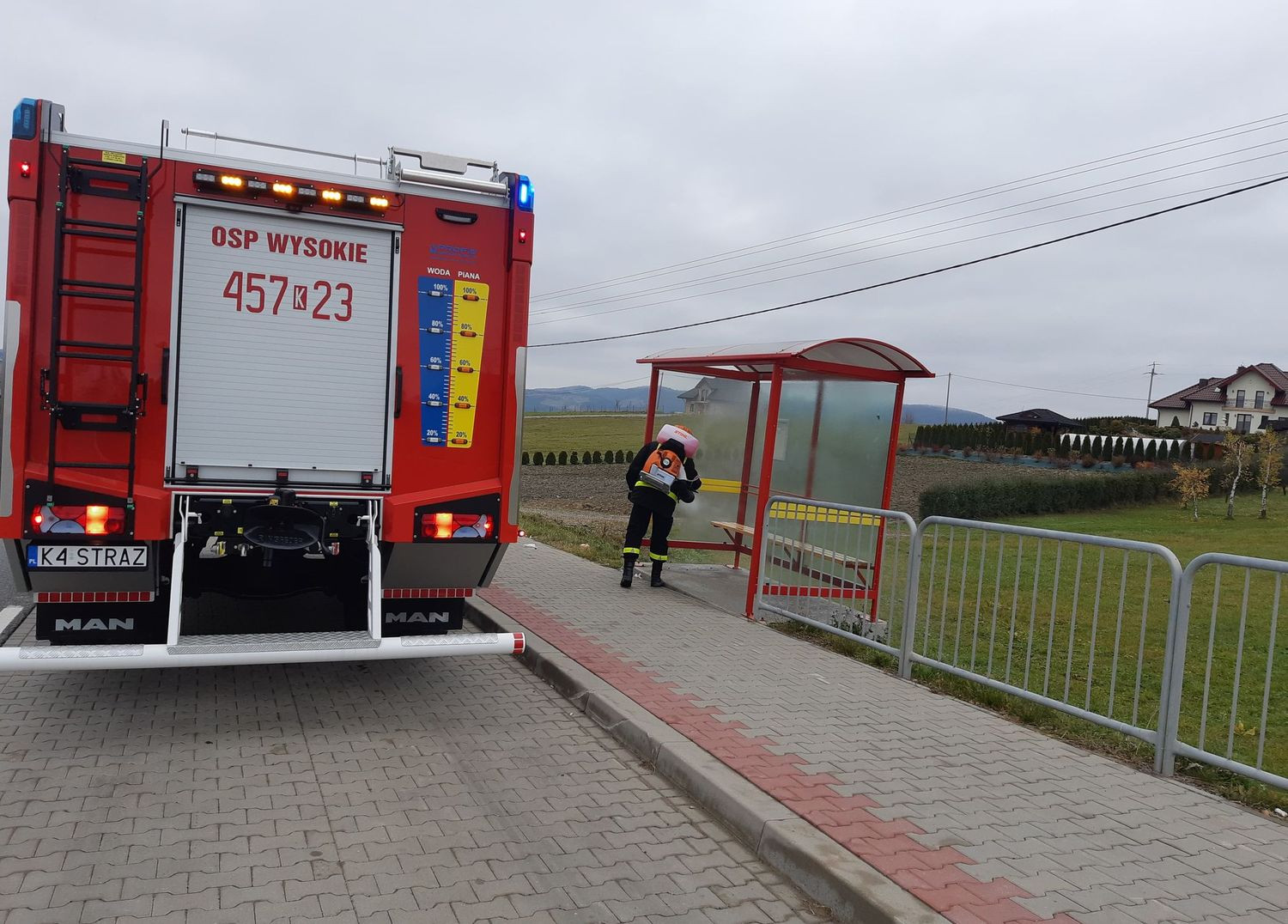 Druhowie z Wysokiego oprócz placówek szkolnych i przystanków dezynfekowali także ścianę zewnętrzną i wejście główne do budynku Urzędu Gminy.