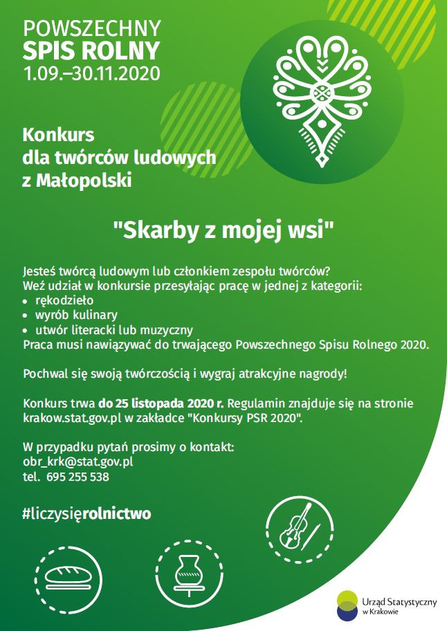 Celem konkursu jest promocja Powszechnego Spisu Rolnego 2020 wśród twórców ludowych i społeczności lokalnej, a także promocja twórczości artystów, tradycji i kultury ludowej Małopolski.