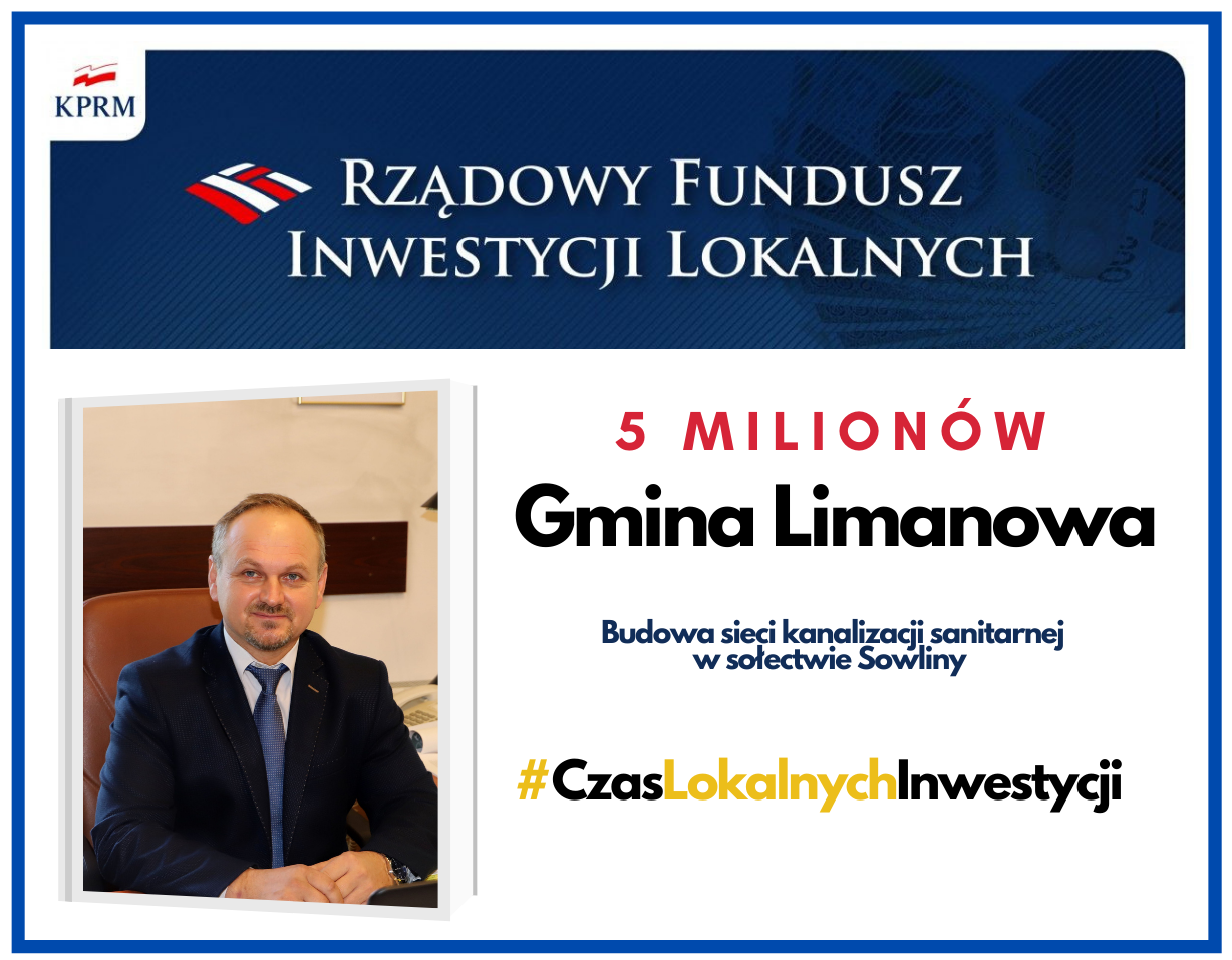 W ramach Rządowego Funduszu Inwestycji Lokalnych gmina Limanowa otrzymała kwotę w wysokości 5 milionów złotych na zadanie związane z budową sieci kanalizacyjnej w Sowlinach. Jest to bezzwrotna pomoc finansowa, która pochodzi z funduszu COVID-19.