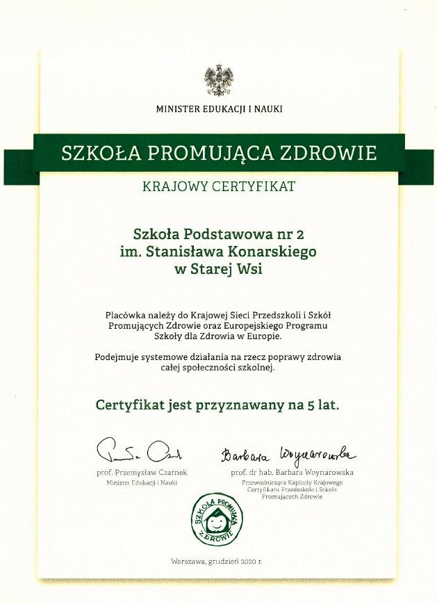 Szkoła Podstawowa nr 2 im. Stanisława Konarskiego w Starej Wsi dostąpiła ogromnego zaszczytu otrzymania Krajowego Certyfikatu Szkoły Promującej Zdrowie. To prestiżowe wyróżnienie zostało przyznane placówce przez Ministra Edukacji Narodowej, Przemysława Czarnka, na podstawie rekomendacji udzielonej przez Centralną Kapitułę Krajowego Certyfikatu Szkoła Promująca Zdrowie działającą przy Ośrodku Rozwoju Edukacji w Warszawie.