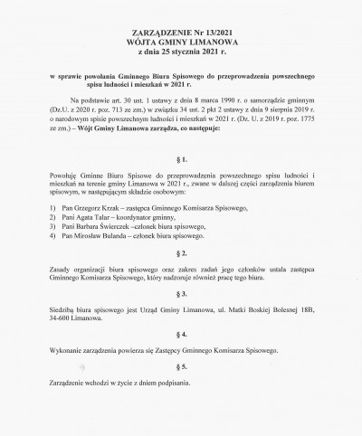 Informujemy również, że ZARZĄDZENIEM Nr 13/2021 WÓJTA GMINY LIMANOWA z dnia 25 stycznia 2021 r zostało powołane Gminne Biuro Spisowe do przeprowadzenia powszechnego spisu ludności i mieszkań na terenie gminy Limanowa w 2021 r w następującym składzie osobowym: