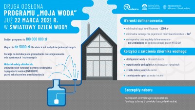 22 marca 2021 r., Narodowy Fundusz Ochrony Środowiska i Gospodarki Wodnej uruchamia drugą odsłonę programu „Moja Woda”. Wnioski o dotacje do 5 tysięcy złotych na przydomowe instalacje zatrzymujące wody opadowe i roztopowe można składać do wojewódzkich funduszy ochrony środowiska i gospodarki wodnej.