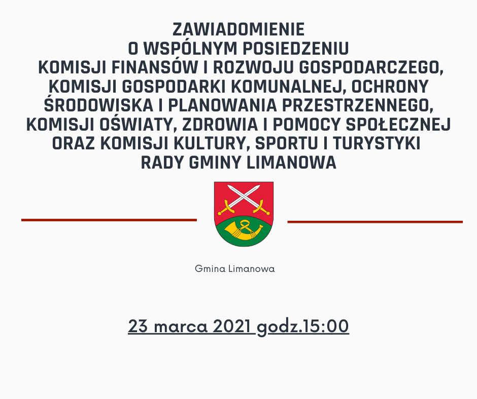 Na podstawie § 60 ust. 1, ust. 3 i ust. 7 uchwały Nr XXIX/278/2018 Rady Gminy Limanowa z dnia 6 września 2018 r. w sprawie Statutu Gminy Limanowa (Dz. Urz. Woj. Mał. z 2018 r. poz. 6395) zapraszam na wspólne posiedzenie Komisji Finansów i Rozwoju Gospodarczego, Komisji Gospodarki Komunalnej, Ochrony Środowiska i Planowania Przestrzennego, Komisji Oświaty, Zdrowia i Pomocy Społecznej oraz Komisji Kultury, Sportu i Turystyki Rady Gminy Limanowa, które odbędzie się w dniu 23 marca