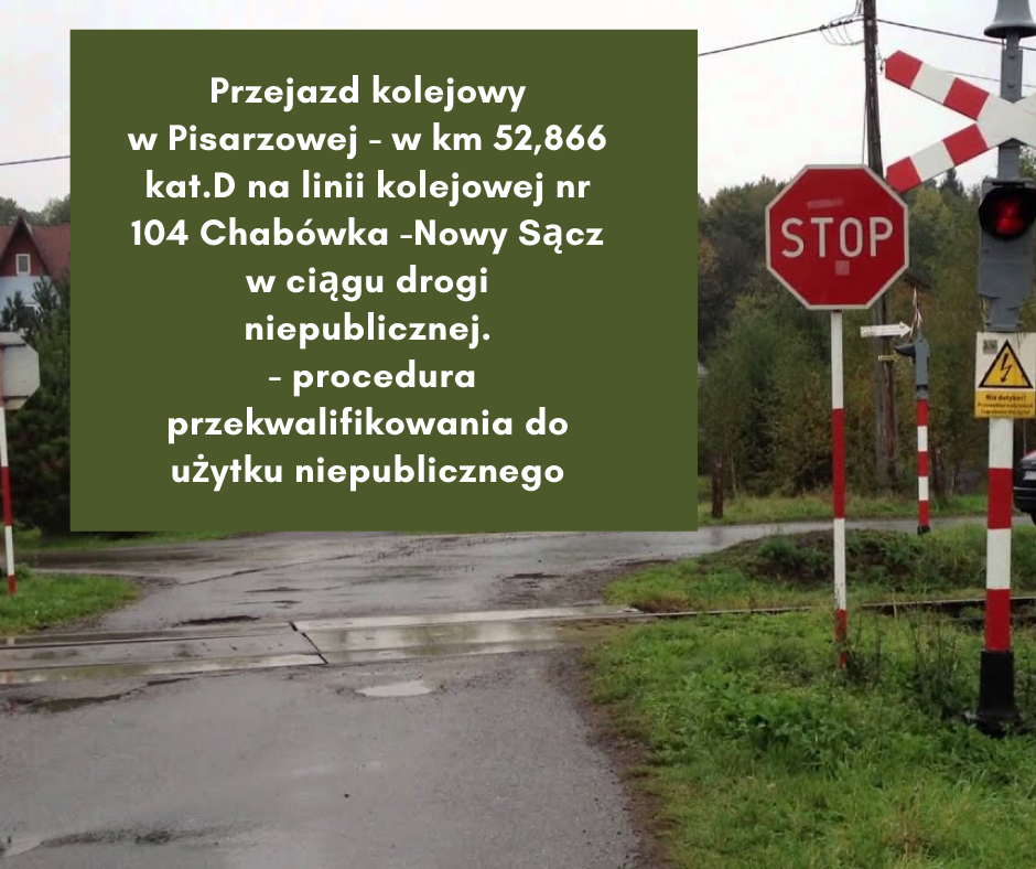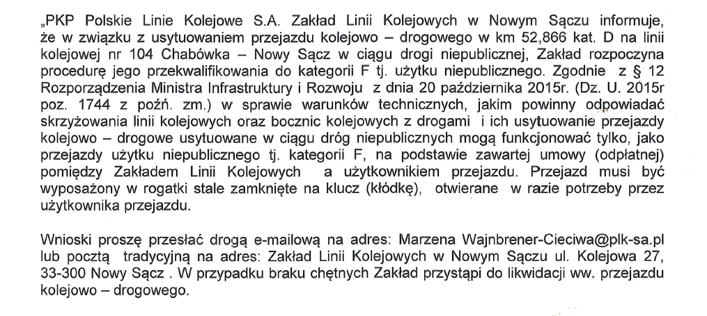 PKP Polskie Linie Kolejowe S.A. Zakład Linii Kolejowych w Nowym Sączu informuje , że rozpoczyna procedurę przekwalifikowania do kategorii F lub likwidacji przejazdu kolejowo-drogowego w km 52,866 kat. D na linii kolejowej nr 104 Chabówka -Nowy Sącz w Pisarzowej.