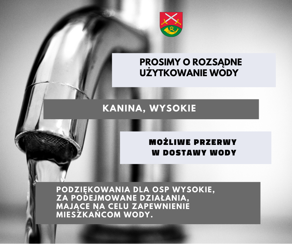 W związku z tym, iż woda na Kanine i Wysokie dostarczana jest z wodociągu w Chełmcu, który nadal przechodzi awarię możliwe będą przerw w dostawie wody w  tych miejscowościach.