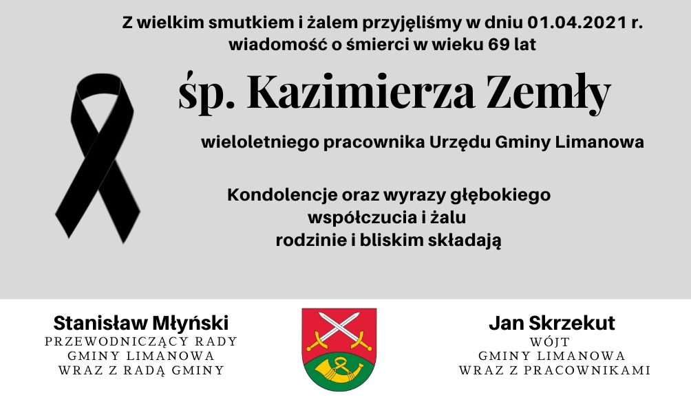 Z wielkim smutkiem i żalem przyjęliśmy w dniu 01.04.2021 r. wiadomość o śmierci w wieku 69 lat śp. Kazimierza Zemły wieloletniego pracownika Urzędu Gminy Limanowa.