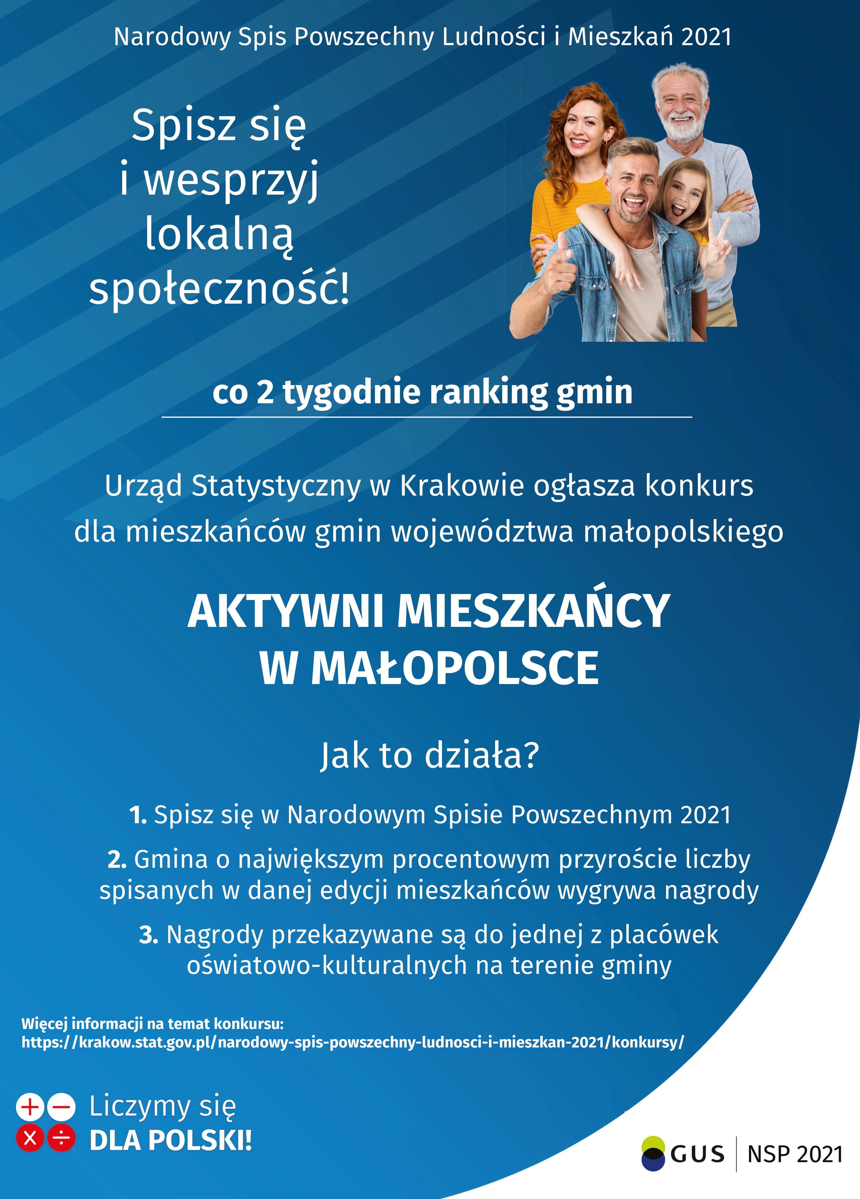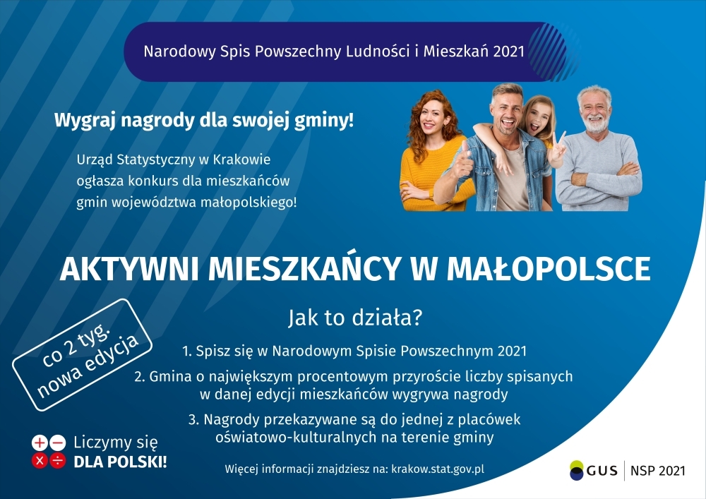 W ramach promocji Narodowego Spisu Powszechnego Ludności i Mieszkań 2021 Urząd Statystyczny w Krakowie organizuje konkurs „Aktywni mieszkańcy w Małopolsce". Konkurs adresowany jest do wszystkich mieszkańców województwa, którzy poprzez udział w Narodowym Spisie Powszechnym Ludności i Mieszkań 2021, mają możliwość wypromowania swojej gminy oraz wsparcia znajdujących się na jej terenie jednostek oświatowo-kulturalnych.