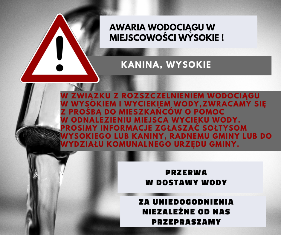 W ZWIĄZKU Z ROZSZCZELNIENIEM WODOCIĄGU  W WYSOKIEM I WYCIEKIEM WODY, ZWRACAMY SIĘ   Z PROŚBĄ DO MIESZKAŃCÓW O POMOC  W ODNALEZIENIU MIEJSCA WYCIEKU WODY. PROSIMY INFORMACJE ZGŁASZAĆ SOŁTYSOM WYSOKIEGO LUB KANINY, RADNEMU GMINY LUB DO WYDZIAŁU KOMUNALNEGO URZĘDU GMINY.