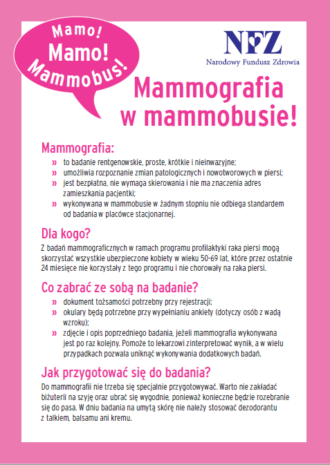 Mammografia jest bezpłatna, nie wymaga skierowania i wykonywana jest niezależnie od miejsca zamieszkania pacjentki.