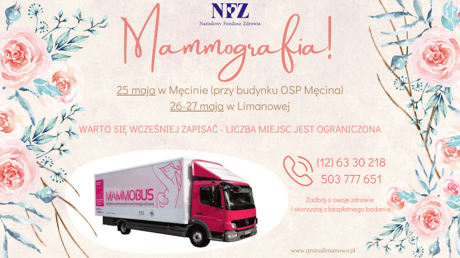 W dniach 25 maja w godz. od 9 do 16 w Męcinie – na placu przy budynku OSP Męcina oraz 26 maja i 27 maja w godz. od 9 do 16 w Limanowej będzie podstawiony mammobus, umożliwiający kobietom wykonanie bezpłatnej mammografii. Warto się wcześniej zarejestrować pod numerem telefonu: (12) 63 30 218 lub 503 777 651. Można również przyjść w dniu badania, ale trzeba pamiętać, że liczba miejsc jest ograniczona.