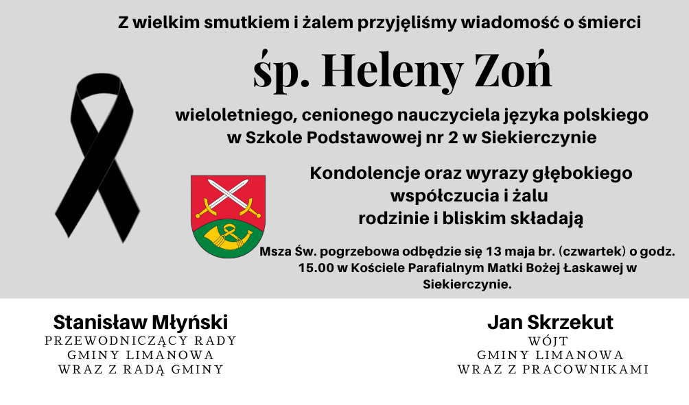 Z wielkim smutkiem i żalem przyjęliśmy wiadomość o śmierci śp. Heleny Zoń wieloletniego, cenionego nauczyciela języka polskiego w Szkole Podstawowej nr 2 w Siekierczynie.