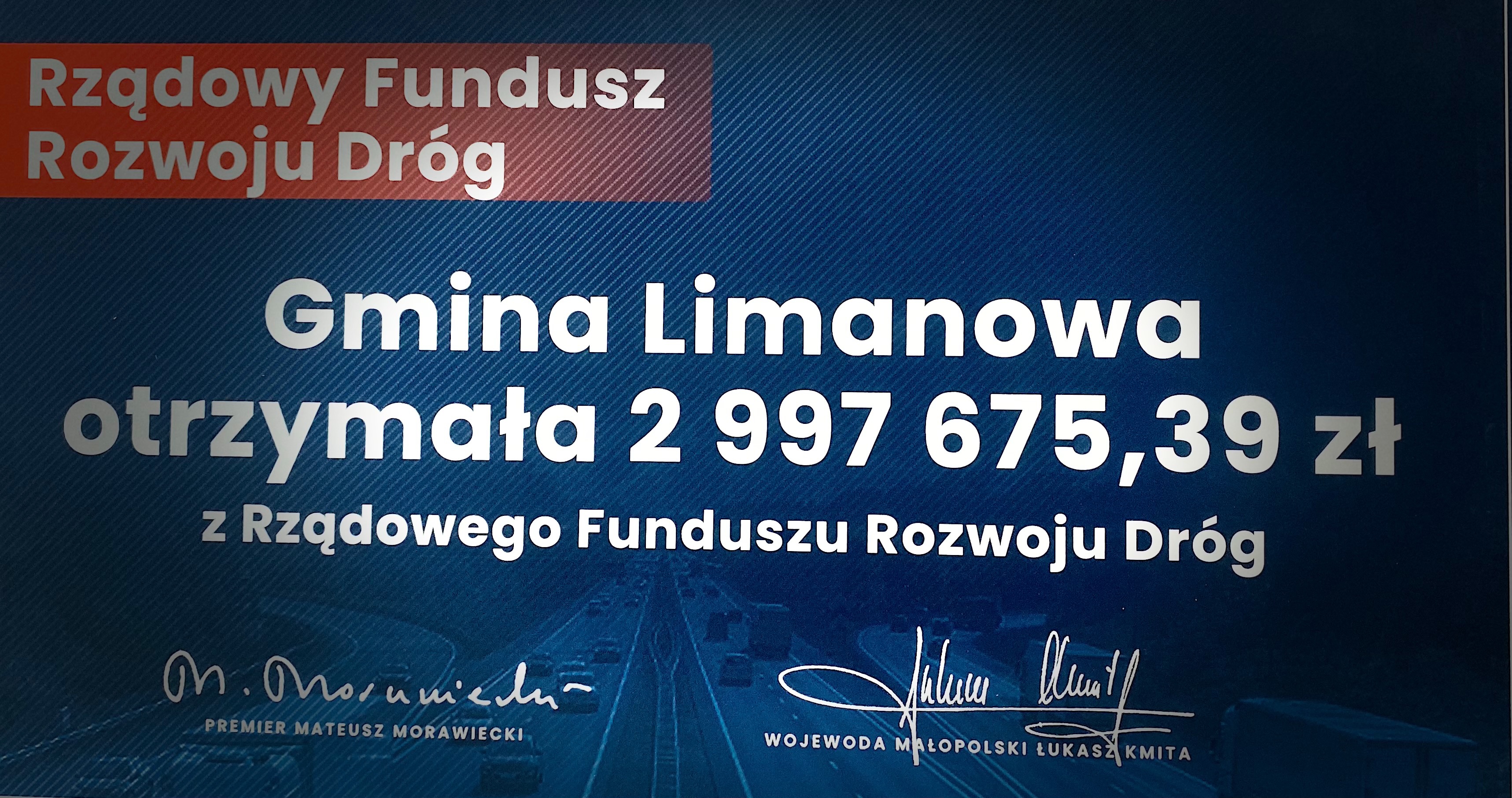Podczas ostatniej sesji Rady Powiatu Limanowskiego w piątek 14 maja br. Wójt Gminy Limanowa Jan Skrzekut odebrał z rąk Pierwszego Wicewojewody Małopolskiego Józefa Leśniaka czek na kwotę 2 mln 997 675,39 zł. To kolejne już środki z Rządowego Funduszu Rozwoju Dróg pozyskane przez Gminę Limanowa