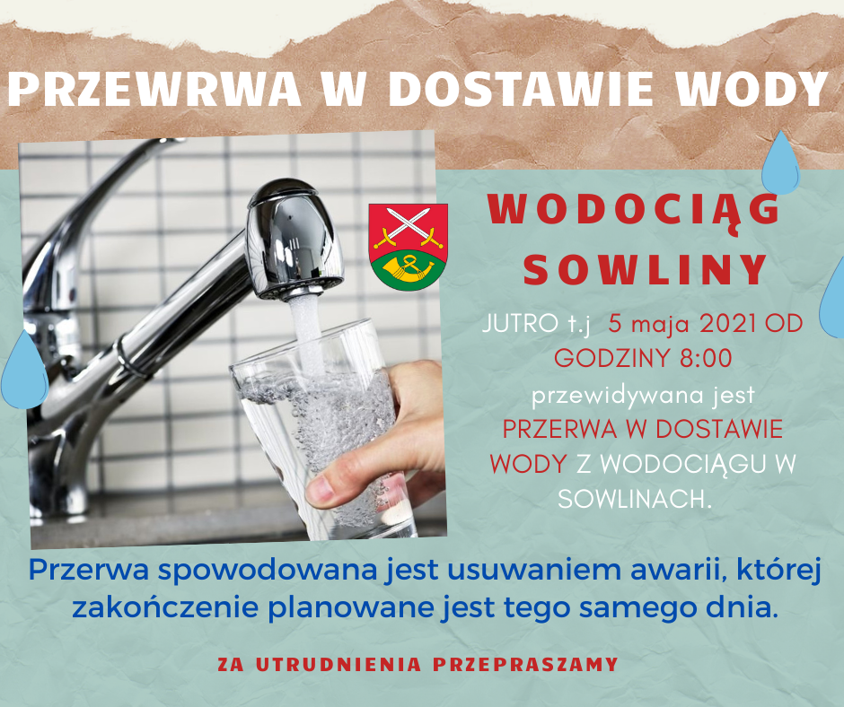 Oficjalny serwisJutro tj. 5 maja 2021 od godziny 8:00 przewidywana jest PRZERWA W DOSTAWIE WODY Z WODOCIĄGU W SOWLINACH. Przerwa spowodowana jest usuwaniem awarii, której zakończenie planowane jest tego samego dnia.