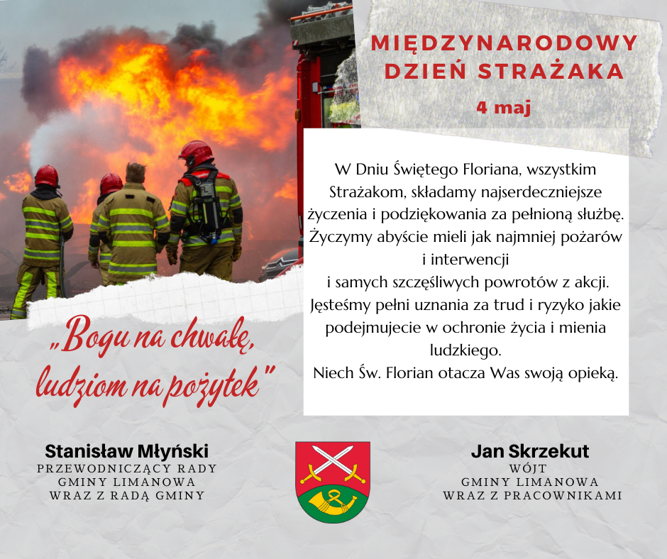 W Dniu Świętego Floriana, wszystkim Strażakom, składamy najserdeczniejsze życzenia i podziękowania za pełnioną służbę.