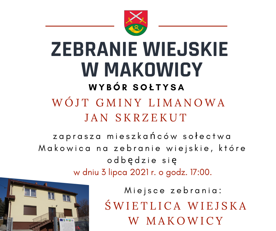Wójt Gminy Limanowa zaprasza mieszkańców sołectwa Makowica na zebranie wiejskie, które odbędzie się w dniu 3 lipca 2021 r. o godz. 17:00  w budynku Świetlicy wiejskiej w Makowicy.