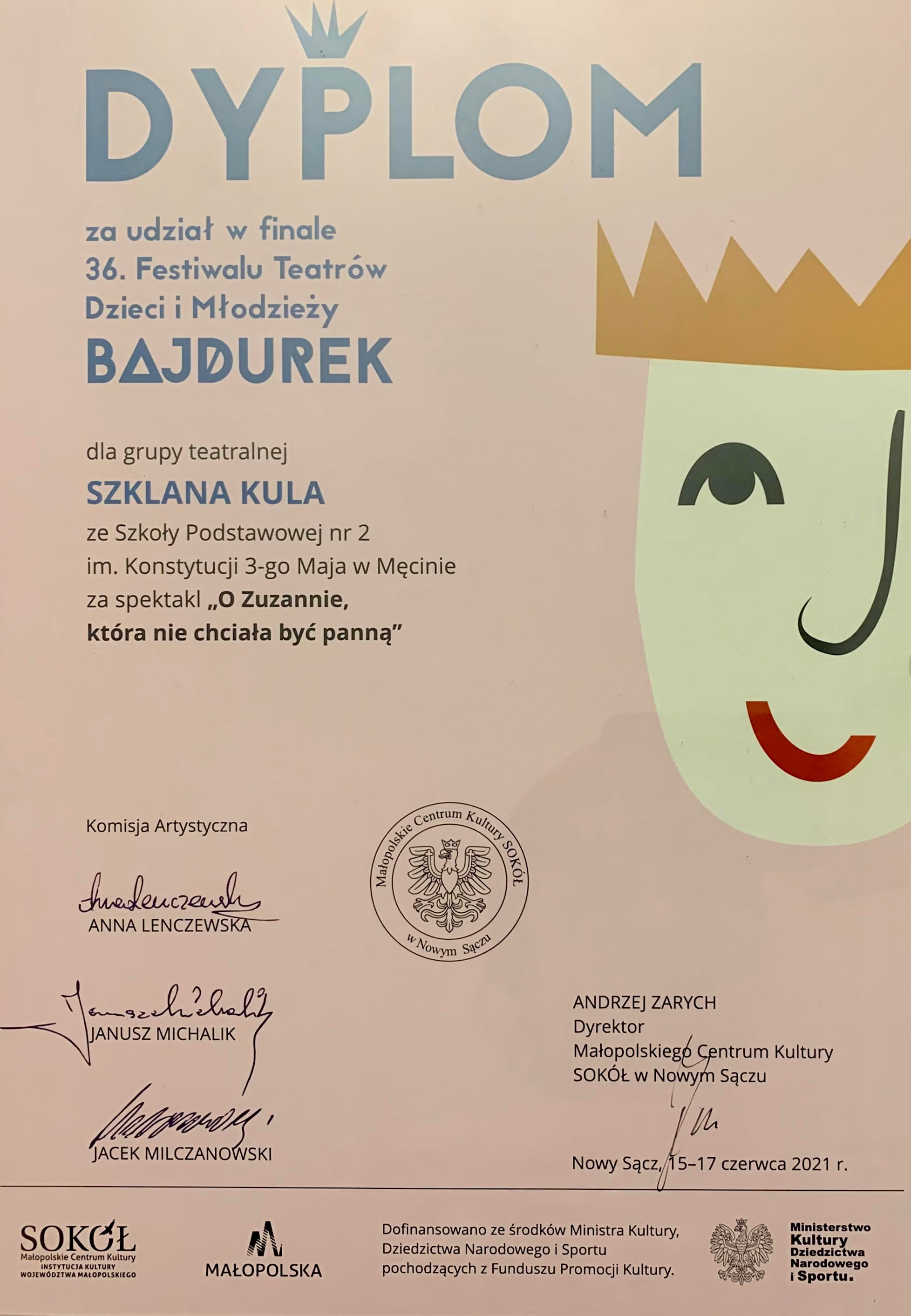 Kolejnym sukcesem okazał się udział w 36. Festiwalu Dzieci i Młodzieży Bajdurek, który odbył się w MCK Sokół w Nowym Sączu. Festiwal ten to teatralna tradycja najmłodszego pokolenia Małopolan, który od 1986 roku na stałe wpisał się w kulturalny kalendarz województwa, tworząc doroczny przegląd dorobku dziecięcych i młodzieżowych zespołów teatralnych. Szklana Kula otrzymała tytuł finalisty za spektakl teatralny pn. O Zuzannie, która nie chciała zostać panną. Nagranie występu zostanie zaprezentowane publiczności na oficjalnej stronie MCK Sokół Nowy Sącz na przełomie września/października br. i ma szansę powalczyć o dodatkową nagrodę publiczności. Serdecznie zapraszamy do głosowania.
