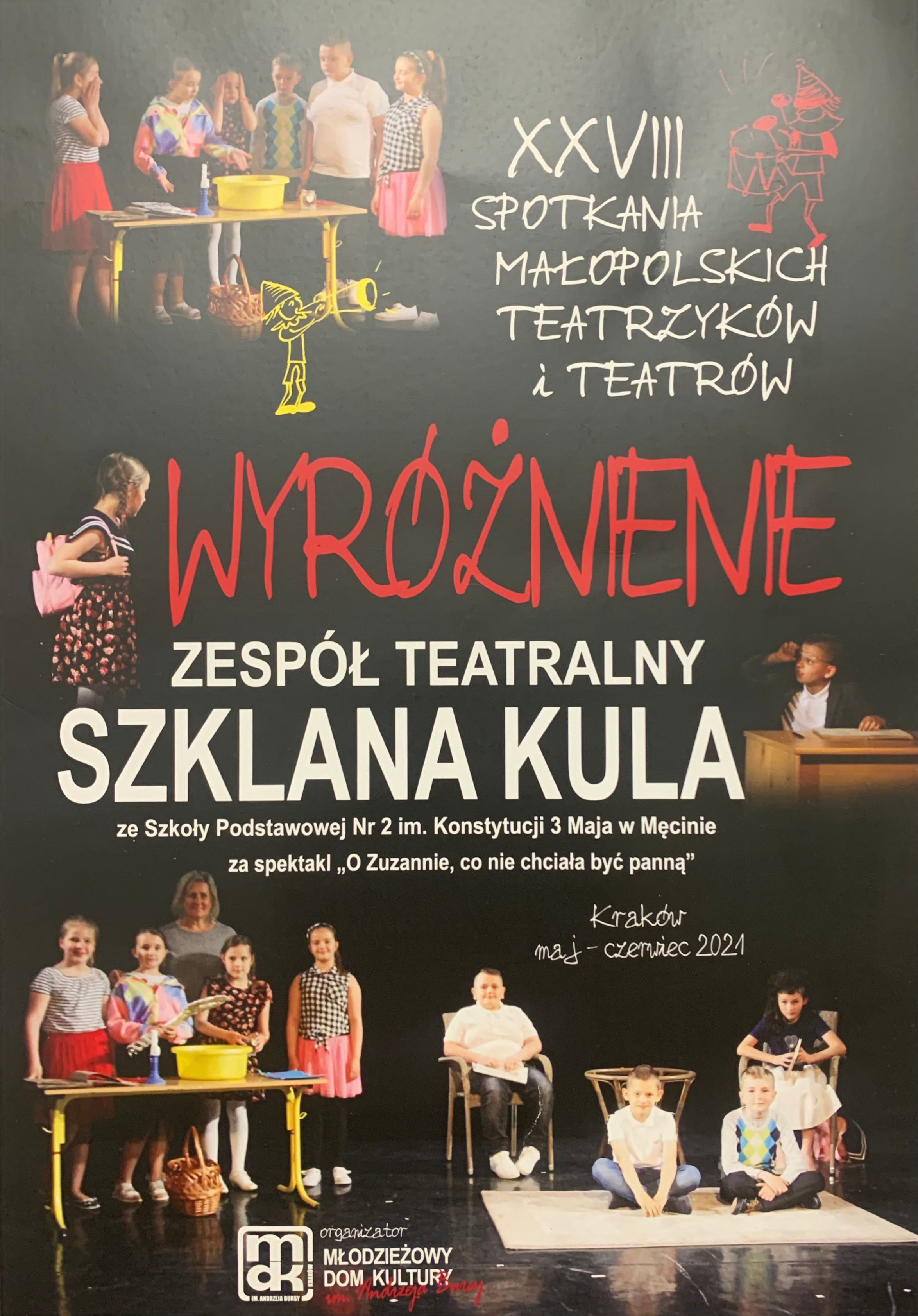 O tym, jak bardzo utalentowani są uczniowie Szkoły Podstawowej nr 2 w Męcinie, mogliśmy przekonać się podczas XXVIII Spotkania Małopolskich Teatrzyków i Teatrów, który został zorganizowany przez Młodzieżowy Dom Kultury im. Andrzeja Busy w Krakowie. Po uzyskaniu nominacji kwalifikującej do udziału w kolejnym, finałowym etapie, zespół zdobył nagrodę wyróżnienia spośród uczestników konkursu.
