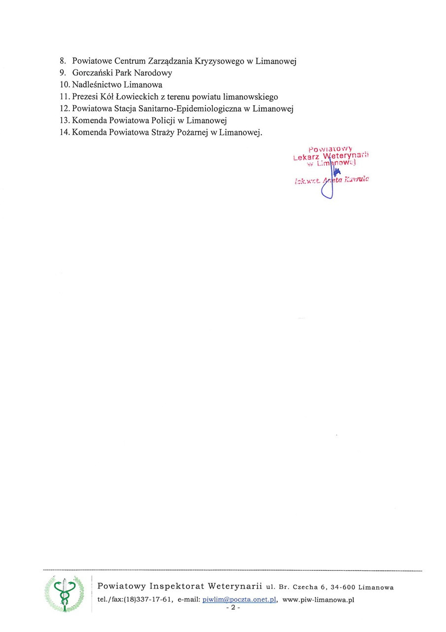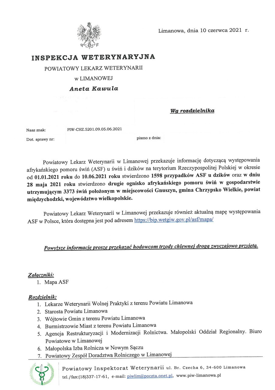 Powiatowy Lekarz Weterynarii w Limanowej informuje o aktualnej sytuacji epizootycznej ASF - afrykańskiego pomoru świń w Polsce.