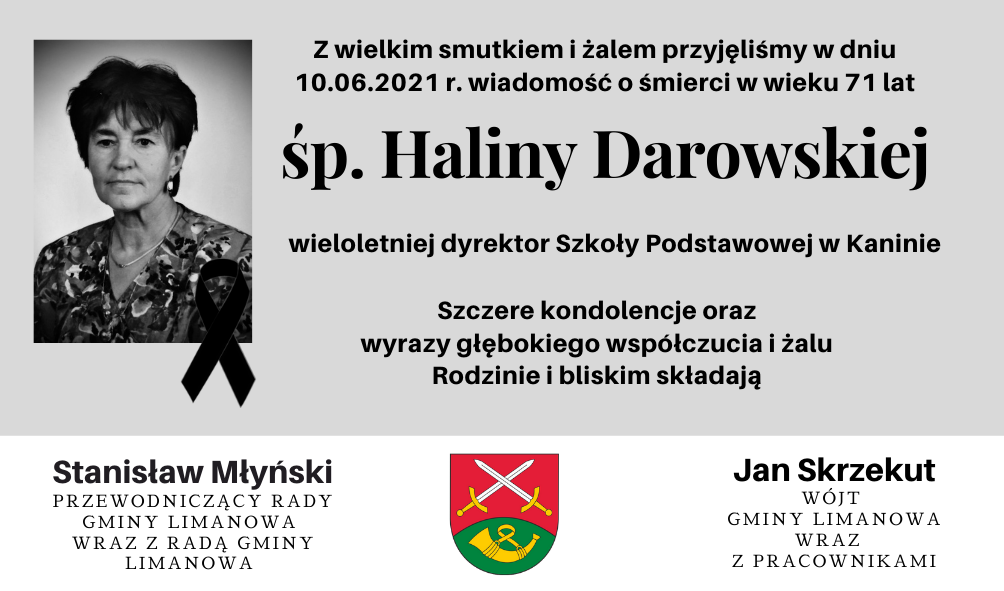 Z wielkim smutkiem i żalem przyjęliśmy w dniu 10.06.2021 r. wiadomość o śmierci w wieku 71 lat śp. Haliny Darowskiej wieloletniej dyrektor Szkoły Podstawowej w Kaninie.