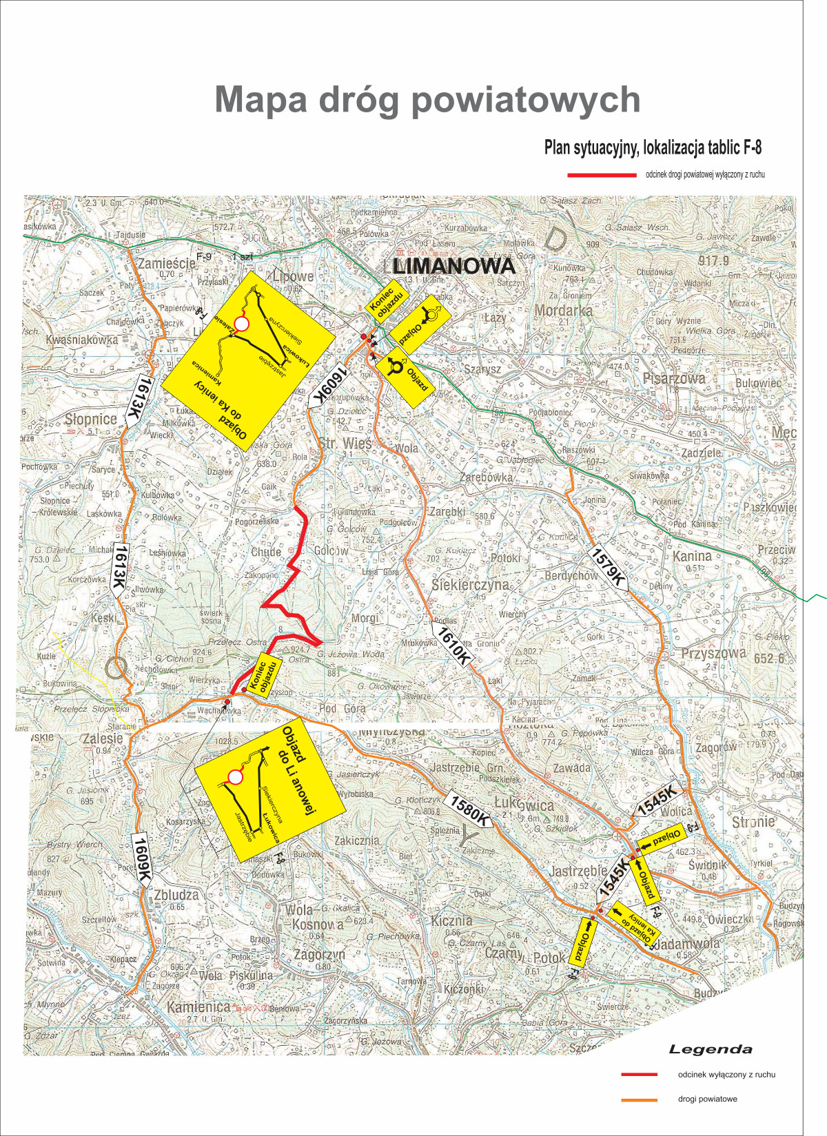 Droga zostanie zamknięta na odcinku Limanowa skrzyżowanie drogi „Limanowa-Kamienica” – „Stara Wieś-Stara Wieś Wola” do na skrzyżowania dróg K1609 Limanowa-Kamienica z K1610 Wierzyczka-Jastrzębie.