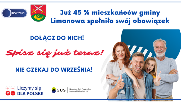 Trwa Narodowy Spis Powszechny 2021. Osoby, które dotąd nie wypełniły obowiązku spisowego, powinny to jak najszybciej zrobić, pamiętając, że do końca spisu pozostało 2,5 miesiąca. Obowiązku spisowego nie wypełniło jeszcze około 55 % mieszkańców gminy Limanowa.