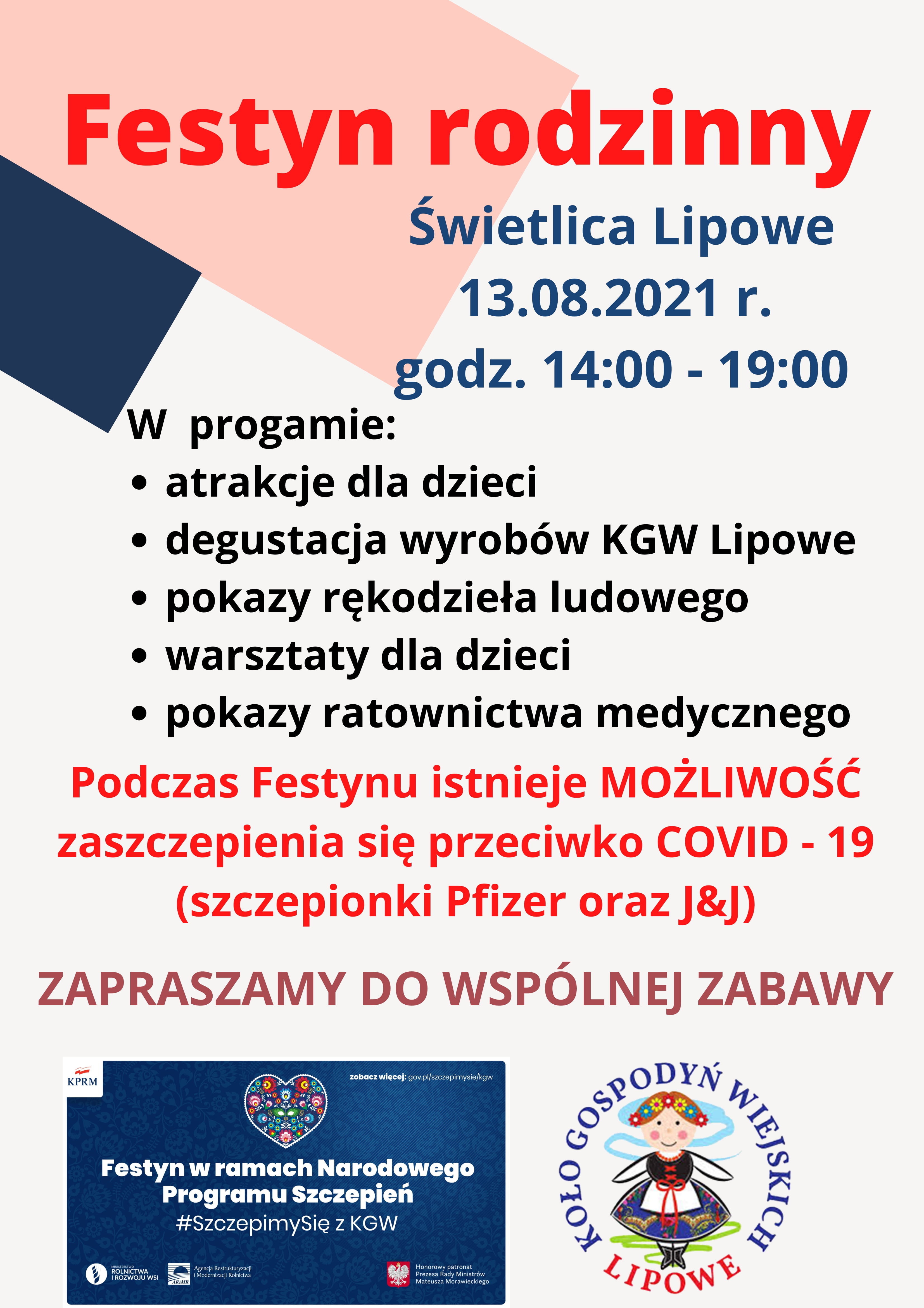 W dniu 13.08.2021 r. w okolicy świetlicy w Lipowem Stowarzyszenie KGW Lipowe organizuje Rodzinny Festyn w ramach akcji #SzczepimySię z KGW.