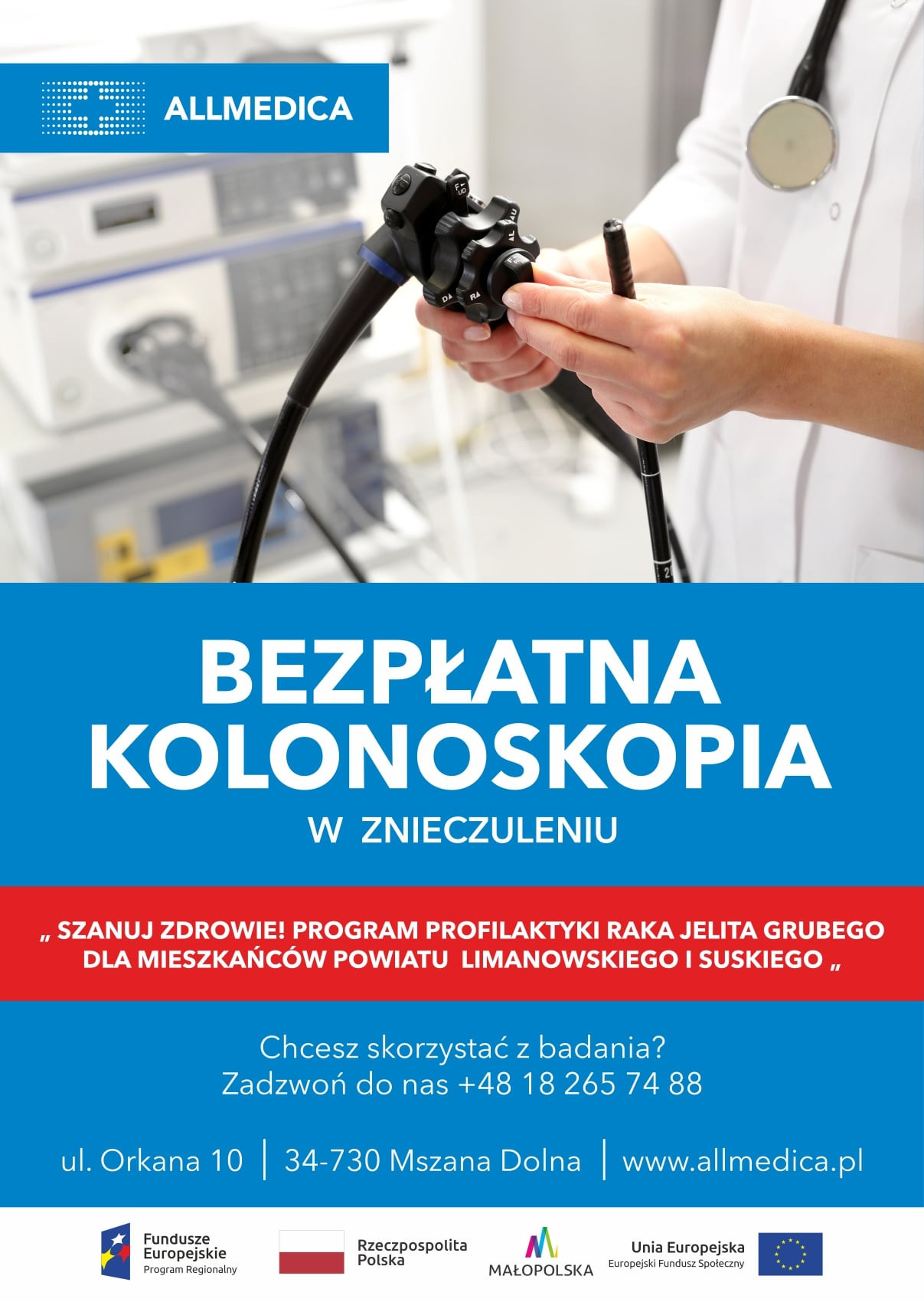 Od maja 2021 r. w Allmedica w Mszanie Dolnej w ramach programu „Szanuj zdrowie! Program profilaktyki raka jelita grubego dla mieszkańców powiatu limanowskiego i suskiego” wykonujemy badania przesiewowe w kierunku raka jelita grubego. Badania są w pełni bezpłatne i w trosce o komfort pacjenta wykonujemy je w pełnym znieczuleniu, przy asyście lekarza anestezjologa. Koszt badania pokrywa w pełni Unia Europejska i Skarb Państwa.