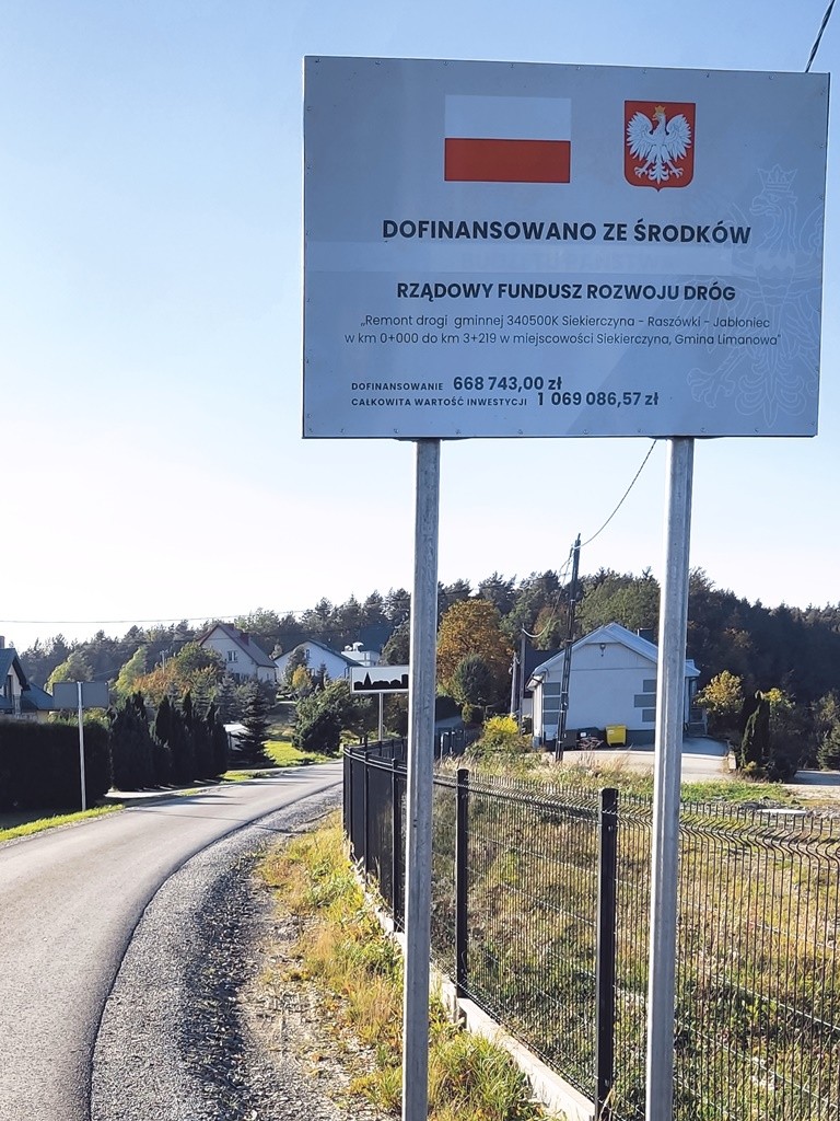 Koszt zadania to 1 069 086,57 zł, przy dofinansowaniu w kwocie 668 743,00 zł pozyskanym przez Gminę Limanowa z Rządowego Funduszu Rozwoju Dróg.