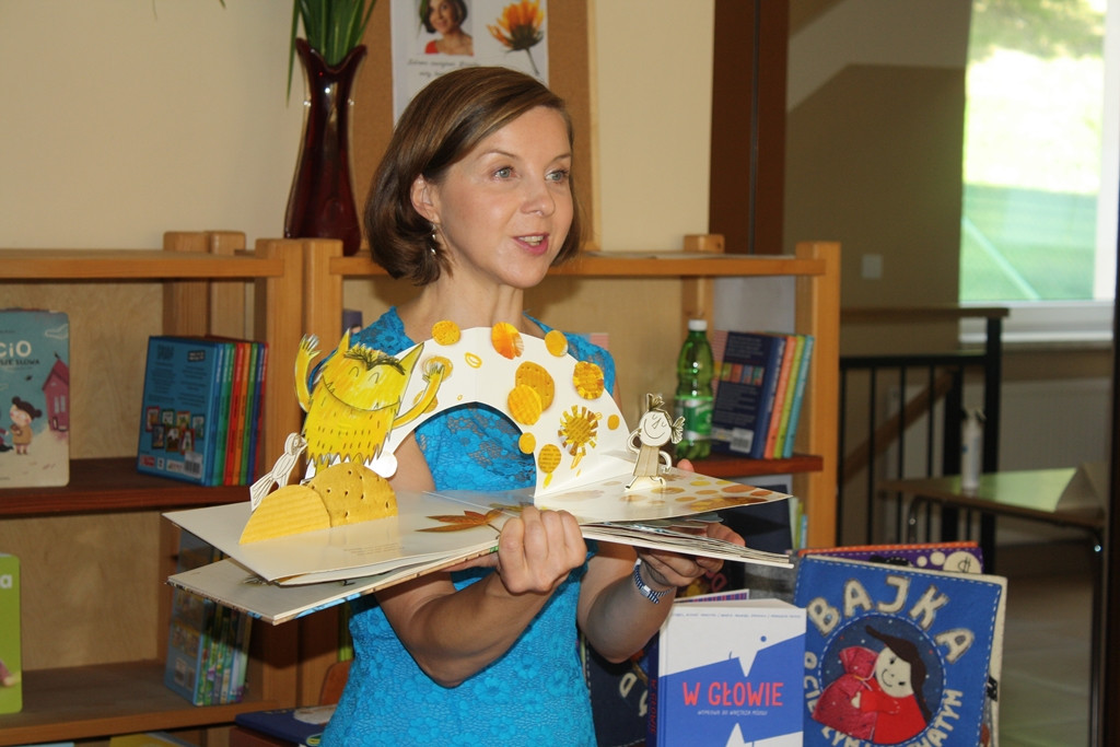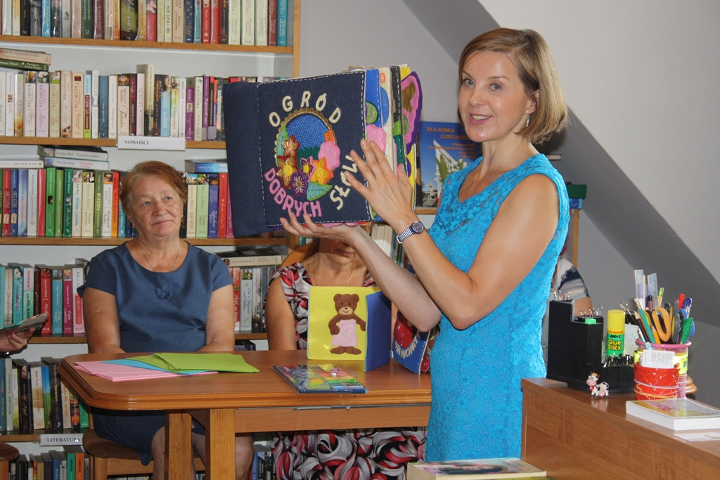 Dzieci i seniorzy z zainteresowaniem słuchali, jak wielkie dobrodziejstwo dla naszej psychiki kryje się w książkach. Najmłodsi z zaciekawieniem zadawali pytania i obrazowali na kartkach swoje uczucia i emocje. Pani dr przywiozła ze sobą ręcznie wykonane książki, które rozbudzały wyobraźnię i kreatywność. Ogromne książki wykonane własnoręcznie z filcu cieszyły się wielkim zainteresowaniem i urzekały starannością wykonania. Trójwymiarowe postacie, przestrzenne obrazy, wprost przenosiły do innego świata i otwierały nowe, intelektualne możliwości, stając się kreatywną kuźnią pomysłów.