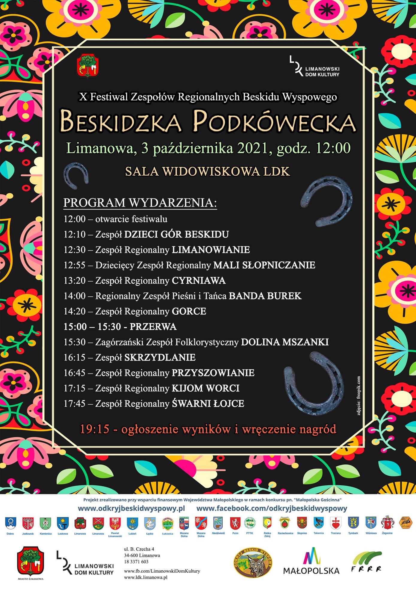 Jubileuszowy X Festiwal Zespołów Regionalnych Beskidu Wyspowego "BESKIDZKA PODKÓWECKA", odbędzie się w Limanowskim Domu Kultury 3 października 2021 roku. Początek festiwalu zaplanowano na godzinę 12.00.