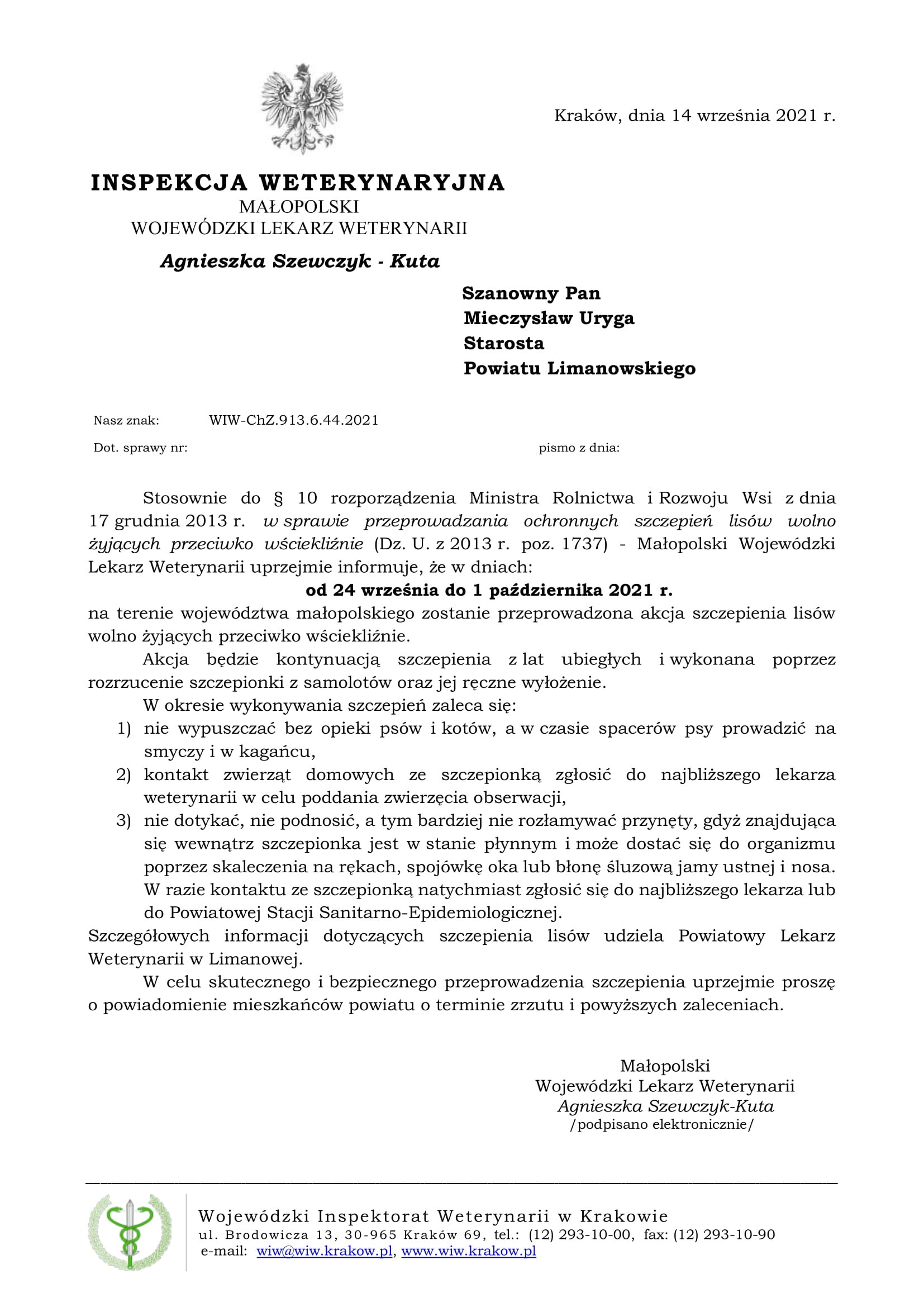 Małopolski Wojewódzki Lekarz Weterynarii informuje o planowanym przeprowadzeniu ochronnych szczepień lisów przeciwko wściekliźnie, które przeprowadzone zostanie od 24 września do 1 października 2021 r.
