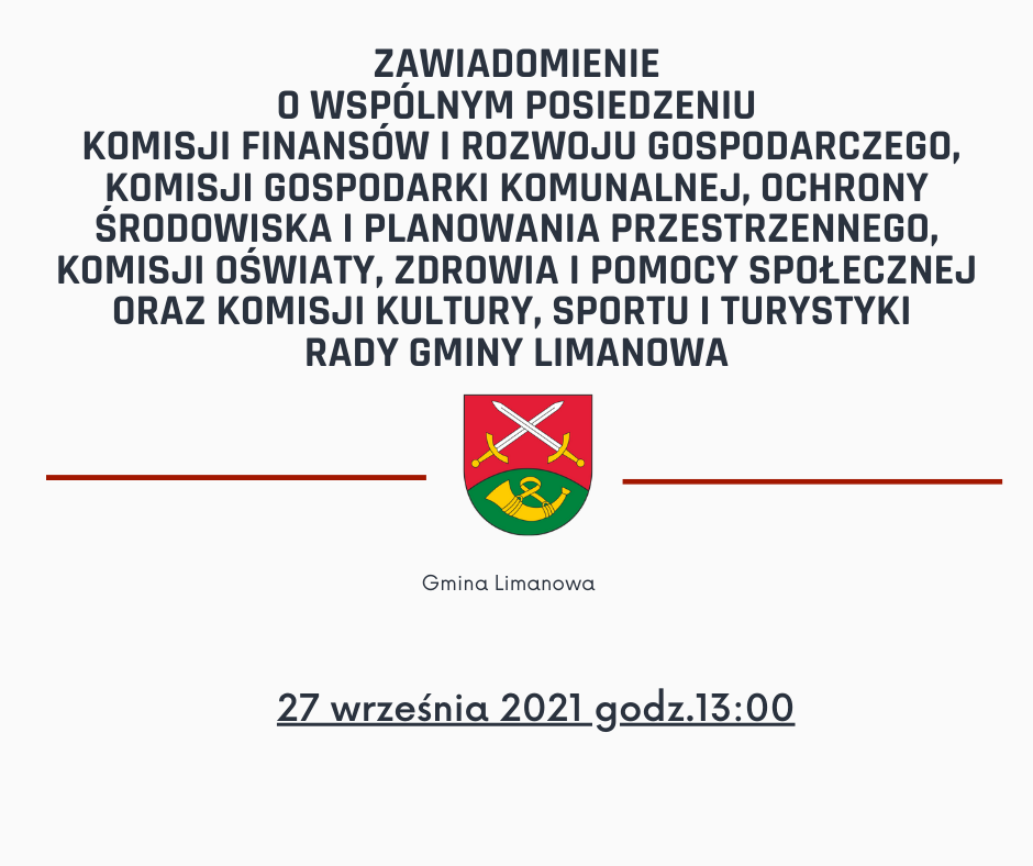 Na podstawie § 60 ust. 1, ust. 3 i ust. 7 uchwały Nr XXIX/278/2018 Rady Gminy Limanowa z dnia 6 września 2018 r. w sprawie Statutu Gminy Limanowa (Dz. Urz. Woj. Mał. z 2018 r. poz. 6395) zapraszam na wspólne posiedzenie Komisji Finansów i Rozwoju Gospodarczego, Komisji Gospodarki Komunalnej, Ochrony Środowiska i Planowania Przestrzennego, Komisji Oświaty, Zdrowia i Pomocy Społecznej oraz Komisji Kultury, Sportu i Turystyki Rady Gminy Limanowa, które odbędzie się w dniu 27 września 2021 r. /poniedziałek/ o godz. 13:00 w sali konferencyjnej Urzędu Gminy Limanowa.